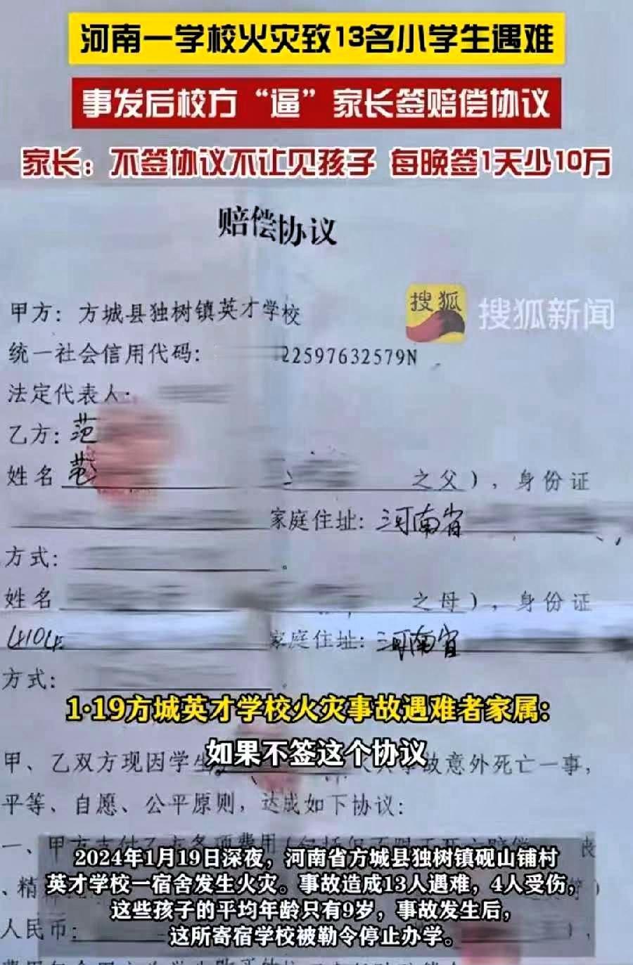 方城火灾赔偿,范啸楠爸爸曾透露,每个学生赔了约130万,拿了钱不能再追究 当初签协议,没人是冲着钱去的。最艰难的时候,不签字就见不到孩子最后一面,为人父母,到了那份上,哪还有选择的余地? 范爸爸说那笔钱一分没动,就放在那儿,不是矫情,是真的动不了——那不是普通的存款,是孩子用命换来的,每一笔都连着念想,碰一下都觉得心里发堵。 范奶奶的心思,更是让人心酸。全家都搬走了,就她执意要留在老房子,说“孩子要是回来,找不着人咋办”。 老人不懂什么协议条款,也没想过要争什么,她就认一个理:这是孙子住惯的家,不能没人等他。那些年里,她天天接送孩子,给孩子做爱吃的饭,如今孩子不在了,她守着空房子,就像还在等孙子放学回家。 现在站出来的,还有几位爷爷。这些孩子大多是老人们帮着带大的,从牙牙学语到背着书包上学,一天一天看着长大,疼得跟心头肉似的。 突然出了这样的事,老人心里的坎,怎么也过不去。他们一把年纪了,不怕麻烦,也不怕所谓的“违约”,就想求个真相:好好的孩子,怎么就没了?该负责的人,能不能站出来? 这些家长和老人,要的从来不是钱。他们只是想让孩子走得明明白白,想得到一个该有的说法,想让孩子知道,家人没放弃为他讨一个公道。 大家心里都清楚,公道不是用钱能换的,也不是一纸协议能压下去的。