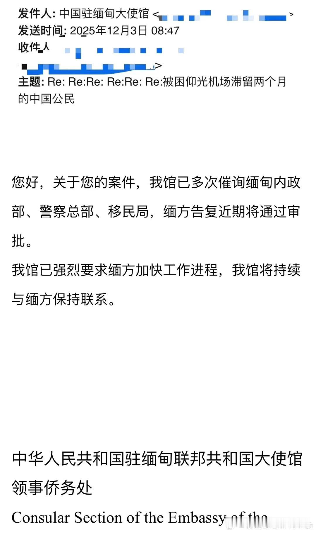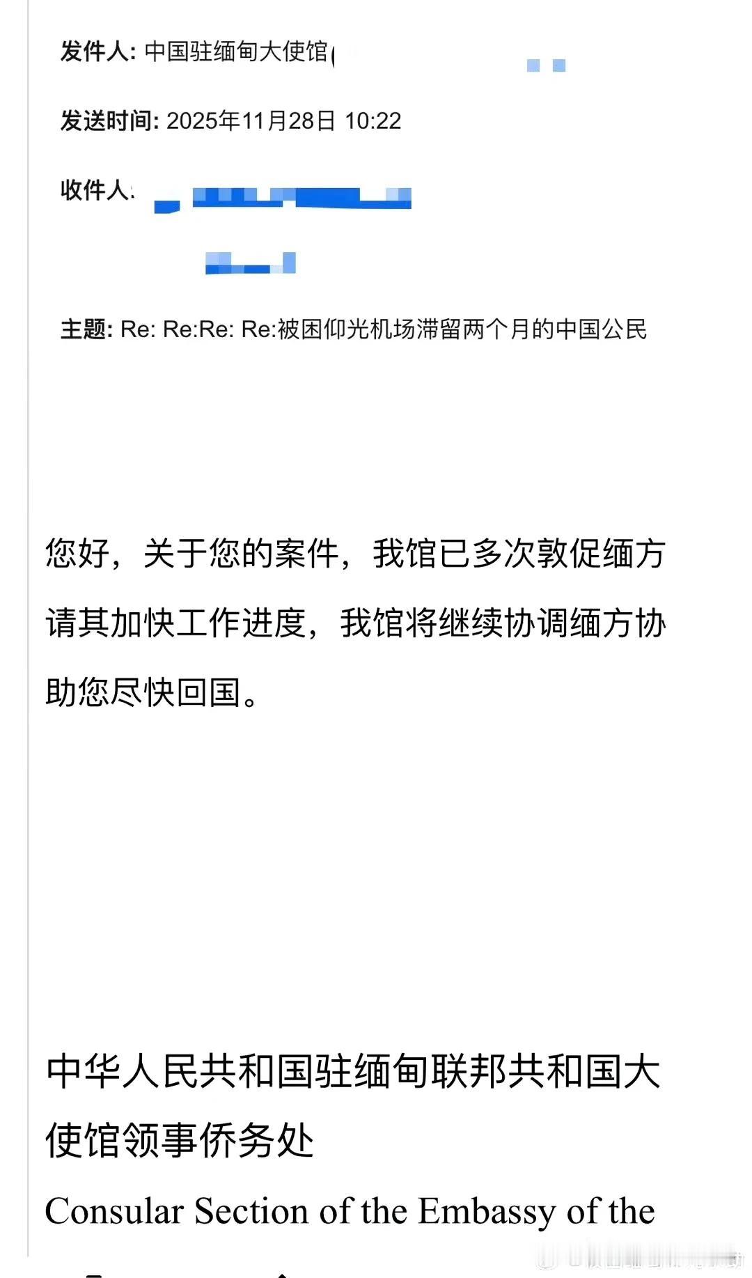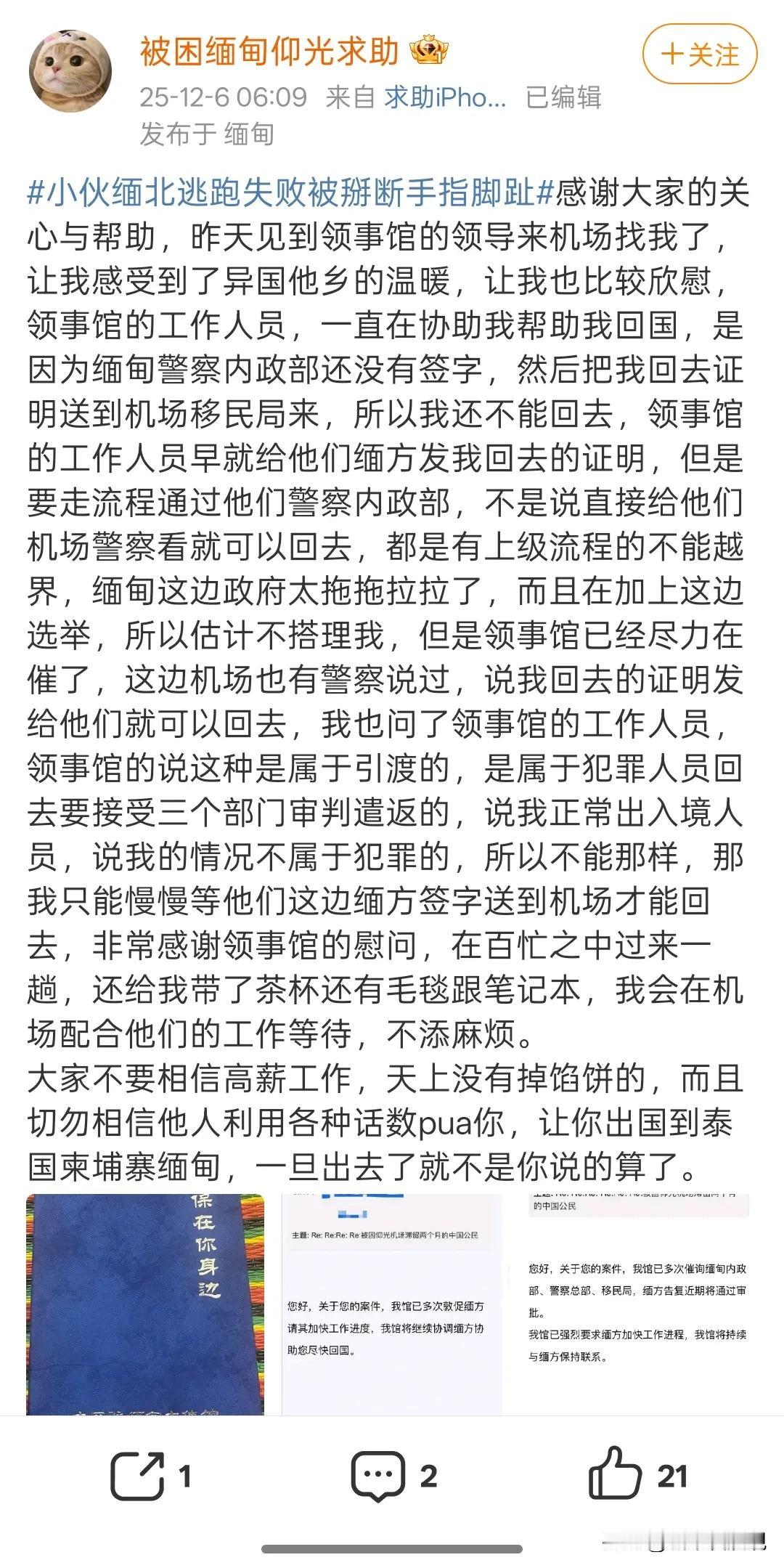 微博一位普通网友,因为相信高薪工作被欺诈前往缅甸仰光。其后不停的在各种渠道上向使官求助。12月6日,历经千辛万苦而联络上使官的网友终于在微博上表示自己被“营救成功”。我们这边的工作人员将他的信息整理好和缅甸政府人员对接,目前正在走流程,等待回国的状态。文末这位微博网友也说,大家不要相信境外高薪工作,让你出国从第三国入境,一旦进入他人骗局的罗网中就难以自拔了。