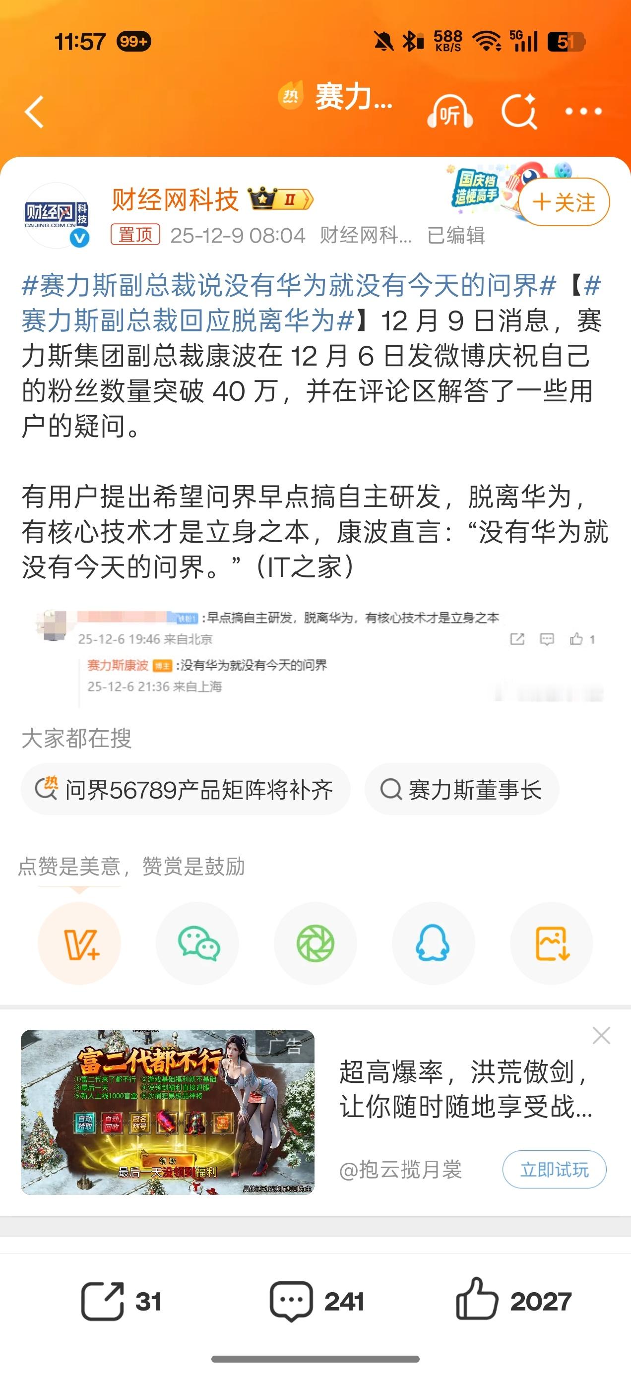 赛力斯副总裁回应脱离华为看得很清楚!