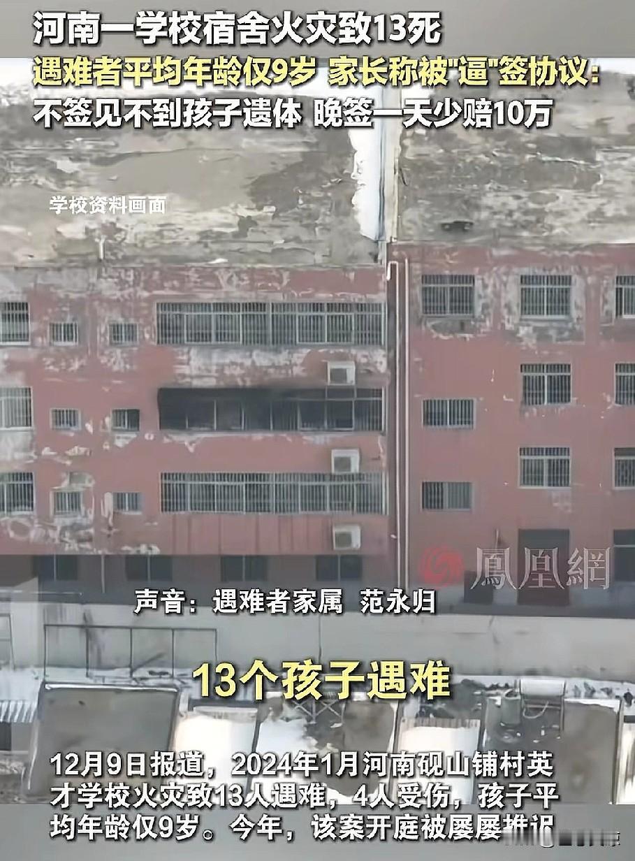 简直目无法纪!孩子遇难后,学校竟公然威胁家属,要求先签订赔偿协议,不签就不许见孩子。协议还规定,家属拿了赔偿款后不得再找学校麻烦,并且晚签一天,赔偿金额就减少10万。 看到这样的新闻,我内心满是愤慨。究竟是谁给了他们这样的权力?希望相关部门严查此事,法永远不能向不法低头。难以想象,在将近两年的时间里,受害者家属是如何熬过来的。如今,此事终于被各大媒体报道,希望能尽快给孩子一个公平公正的结果! 方城县一学校发生火灾13人遇难
