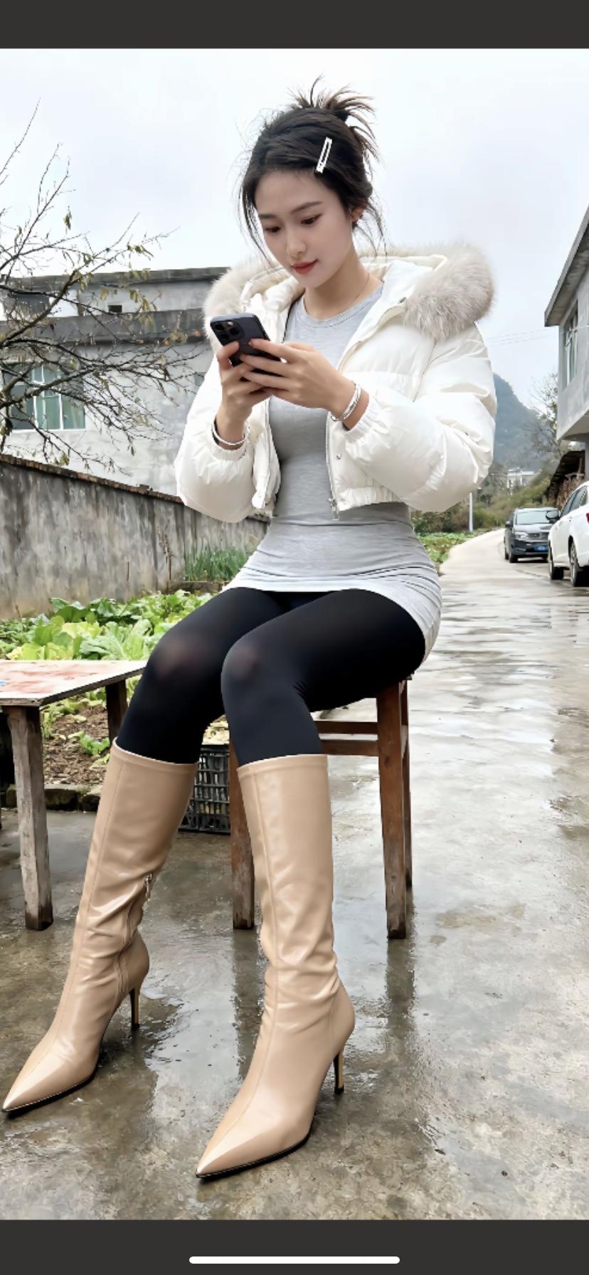 冬日穿搭指南:白色羽绒服+黑色紧身裤+米色长靴,时尚又保暖!