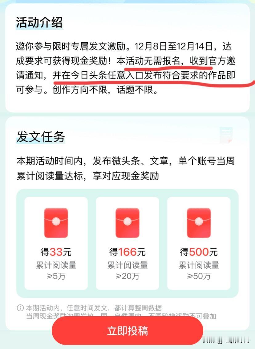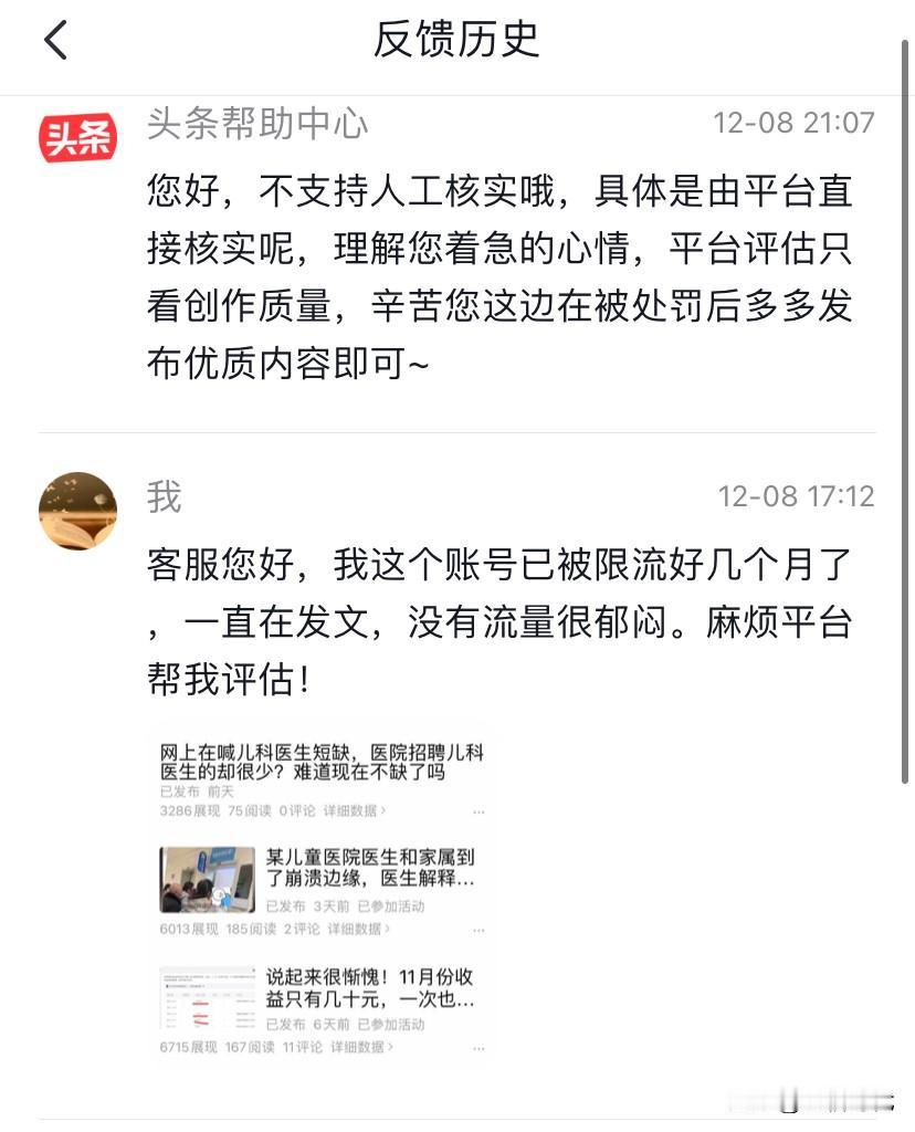 为时两个月限流在昨日解除!喜的是发第一篇文章阅读量就突破20万,意味着可以得166元。担忧的是,不知算不算参加活动成功。 为了这个限流,我曾向平台反馈多次,给我的回复是不支持人工核实,平台会直接核实。 昨日,我发了一个微头条吐槽,邀请我参加限时活动犹如摆设。因为限流根本没什么阅读量。要是再不解除,甚至要放弃头条这个账号。 没想到吐槽文发布一个多小时后,发现展现量与之前有了变化。不知是吐槽文的作用,还是平台眷顾。 昨日傍晚我一激动就写了一篇文章,要知道已经几个月没写文章了。结果发布后,展现量出乎意料的高。 阅读量在一个小时后,就快到一万了,三四个小时后,大概是晚上12点几乎到10万了。 昨晚看到与我久违的这个数据太过激动,我都失眠了。躺在床上每过一小时就翻看数据。直到今天上午达到24万多,展现量几乎停止了。 现在我都记不清,当时发文是不是在第四期限时活动页面投稿的,若不是,能否得166元奖励。 我仔细琢磨了活动的规则,说是今日头条任意入口都可以。我的理解是不在活动页面投稿也该算。 活动只剩四天了,现在选购冲刺50万阅读量,已经达到一半了。 要是有50万阅读量,就可得奖励500元,额外获得500元简直太香了!大家加油吧!