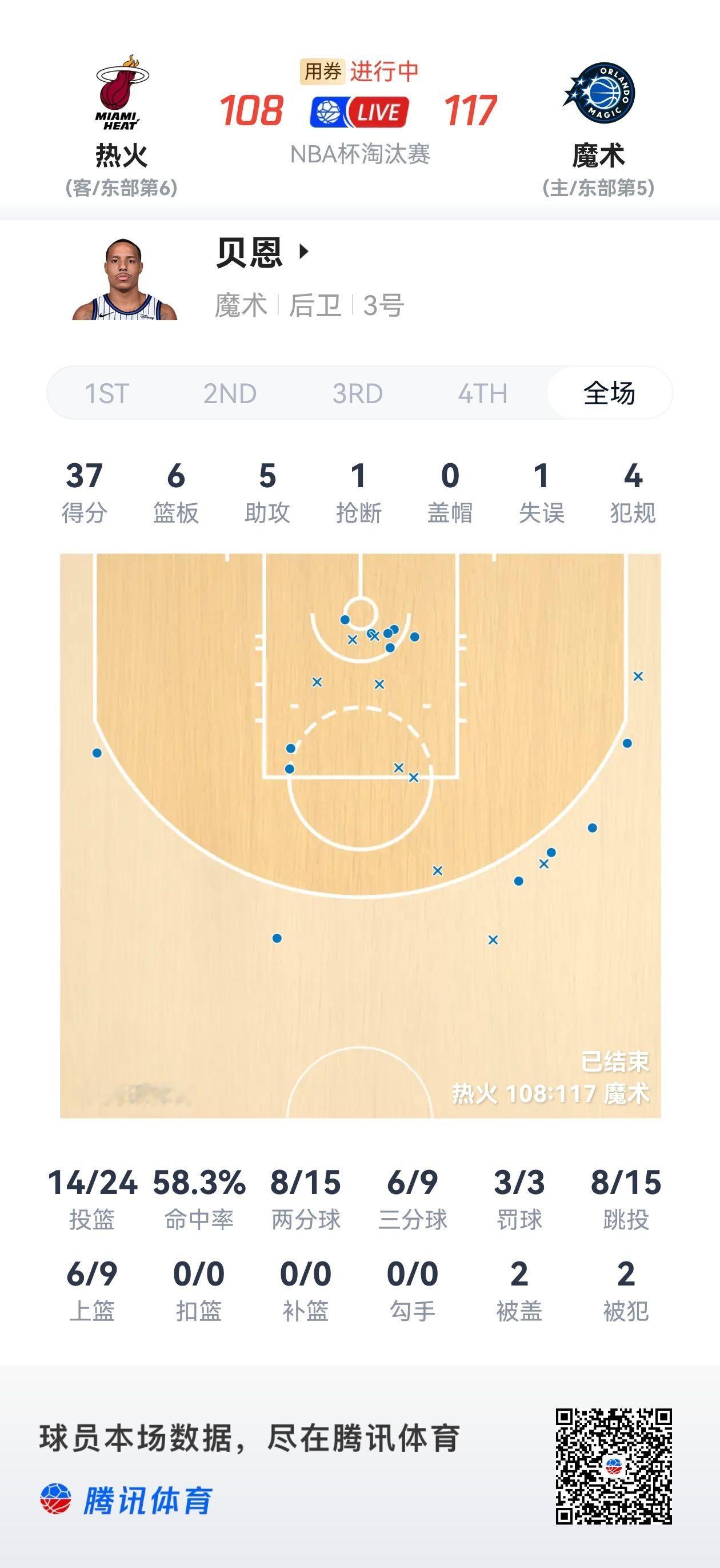 贝恩37分,魔术依靠全队火热手感主场击败热火,率先晋级NBA杯东部决赛。编辑by
