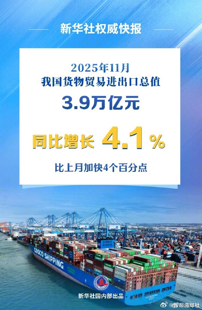 【#11月我国外贸增速回升至4.1%#】海关总署12月8日发布数据显示,2025年11月,我国货物贸易进出口总值3.9万亿元,同比增长4.1%,比上月加快4个百分点。截至11月份,我国货物贸易进出口已连续10个月保持同比增长。从累计看,今年前11个月,进出口总值为41.21万亿元,同比增长3.6%,增速与前10个月持平。(新华社)