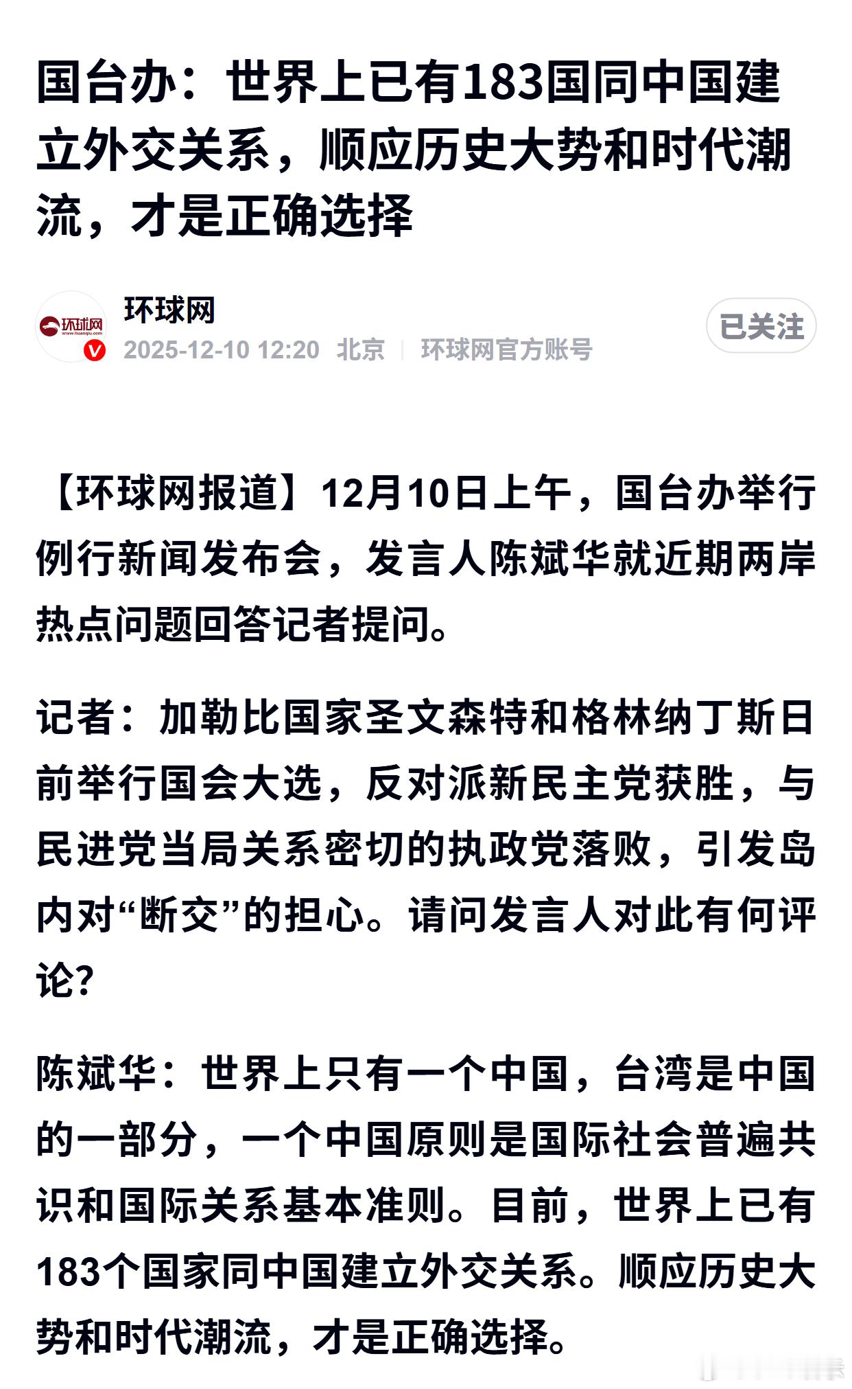 国台办:世界上已有183国同中国建立外交关系,顺应历史大势和时代潮流,才是正确选