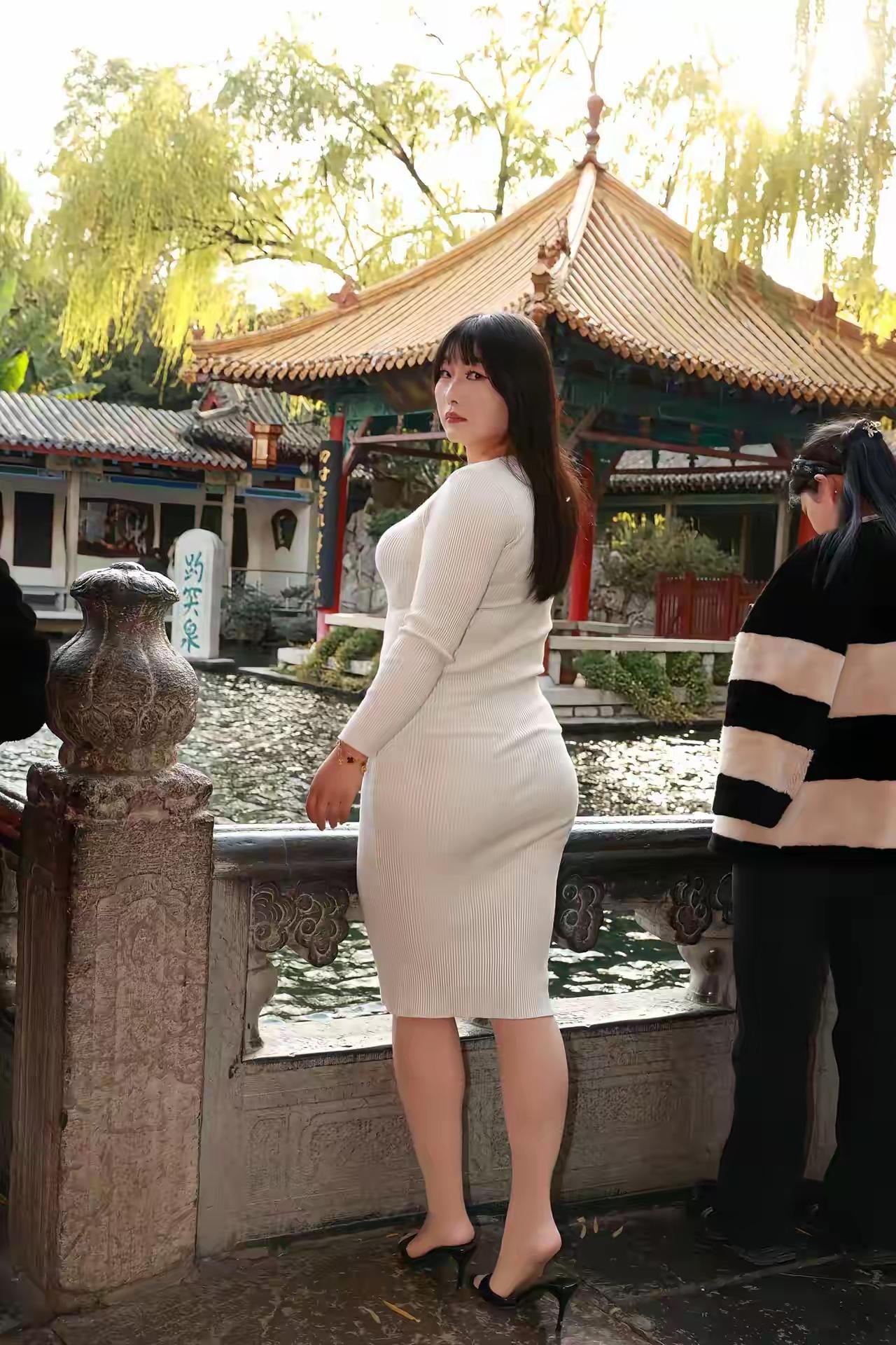 清新夏日穿搭,背对镜头,享受微风拂面的自由时光。