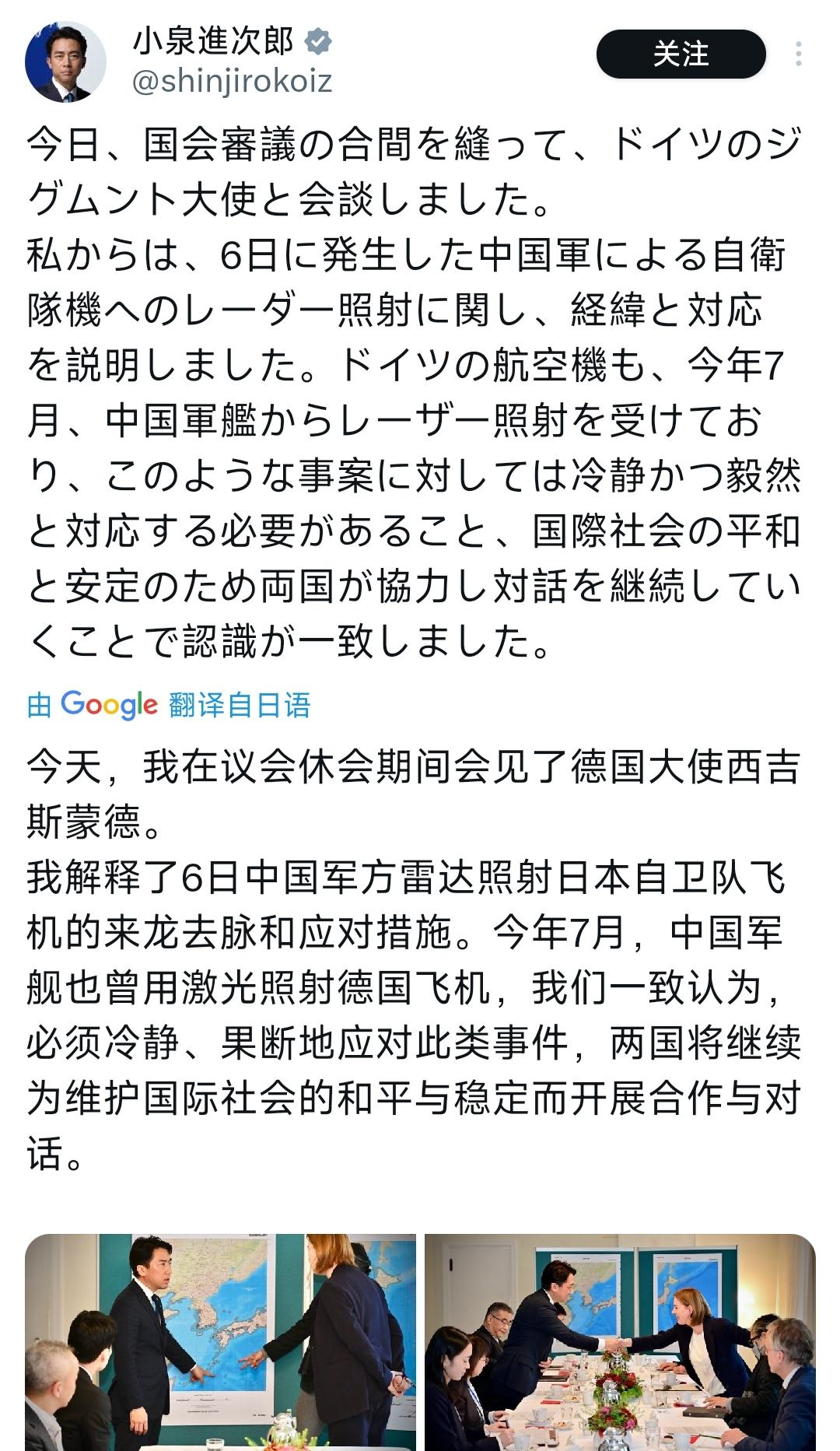 12月9号,日本使出的这一招,的确有一点合格的对手的意思了。防卫大臣小泉进次郎在今天紧急会见了德国驻日本大使,并且向她通报了近期中日战机雷达照射的事件。那么如何理解这个新动向呢? 12月9号防卫大臣小泉进次郎摆出了一副如临大敌的架势,紧急约见了德国驻日本大使。就在前一天,也就是12月8号,德国外长瓦德富尔才刚刚以此高规格访问了北京,并在那里成了多位中国高层的座上宾,眼看着中德在东方握手言欢,日本这边的危机感瞬间爆棚,这一出“地图告状”的大戏,完全就是针尖对麦芒,意图用一场紧急通报来冲抵前一天德国外长访华释放出的暖意。这与其说是一次情报通报,倒更像是一场精心算计的“外交对冲”。 为了极力拉拢这位来自欧洲的盟友,他不仅大谈自己的遭遇,甚至还要帮德国人“回忆痛苦”。他特意翻出了今年7月的老皇历,强调当时德国军机也曾“惨遭”中方军机雷达照射,这就把一种被迫害的叙事强行捆绑在了一起。 可只要稍微懂点地理常识的人摊开那张地图看一眼,就不难发现其中的荒谬之处:德国可是远在欧洲腹地的国家,怎么他们的军机就不远万里、千里迢迢地跑到了中国的家门口来了?一个欧洲边陲的国家跑到亚太来“自由航行”,究竟是谁在制造事端,谁又是那个打破地区宁静的“外来户”,答案其实早就摆在明面上。 日本之所以不仅不避讳这点,反而以此为荣,恰恰是因为他们看中了德国现在的微妙角色,回看过去这一年,德国的军舰又是大张旗鼓地穿越南海,又是忙不迭地和日本海上自卫队搞联合演习,那种想要在东方刷存在感的野心早就藏不住了,小泉进次郎这招棋,正是看准了德国既想要在这片热土上分一杯羹,又还在战略上摇摆不定的心态,他这是在搞“预期管理”,试图用所谓的“雷达照射”制造一种共同的受害者身份,逼着德国人选边站队。 在这场外交博弈的背后,折射出的是东京深层的战略焦虑,日本现在真正心虚的地方,在于眼下美国拜登政府的对华政策摇摆不定,时软时硬,这让长期依赖美日同盟的东京感到一种前所未有的孤立感,所以他们急需在美日同盟之外,找到一个能借力的“第三方支点”。 现在的小泉进次郎,正试图复刻上世纪那种拉帮结派的冷战旧梦,企图用一场场精心策划的“告洋状”来让欧洲国家卷入亚太争端,以此打破地区的力量平衡,但他手里打得再响的算盘,也未必能算得准如今的天下大势,毕竟现在的德国早就不是二战那个军国主义战车,他们和中国的利益盘根错节,是不是真愿意为了日本那点不可告人的小心思去火中取栗,恐怕还得在这个经济与安全的天平上好好掂量掂量。 日本这一手看似有着围棋高手的风范,既显锋芒又不露声色,但这种试图把水搅浑、通过制造外部危机来凝聚内部共识的险招,最后能不能成,终究不取决于他在地图上比划得有多用力。