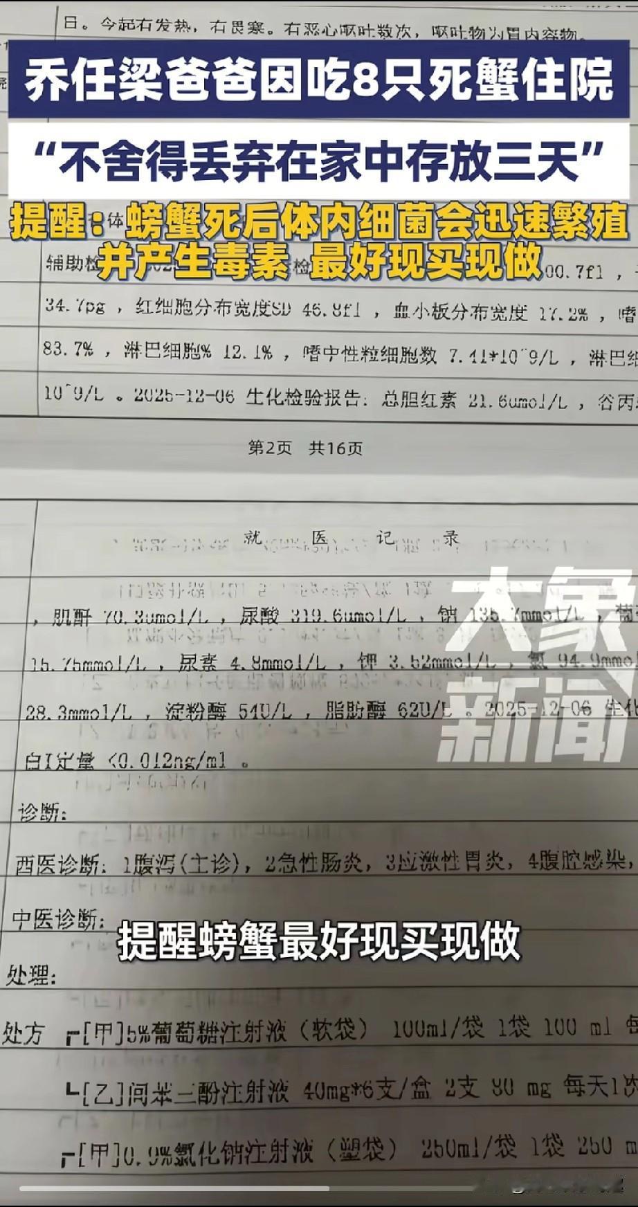 煮熟放久了的大闸蟹千万不能吃。乔任梁的爸爸就是因为吃了8只变质的大闸蟹之后发烧住