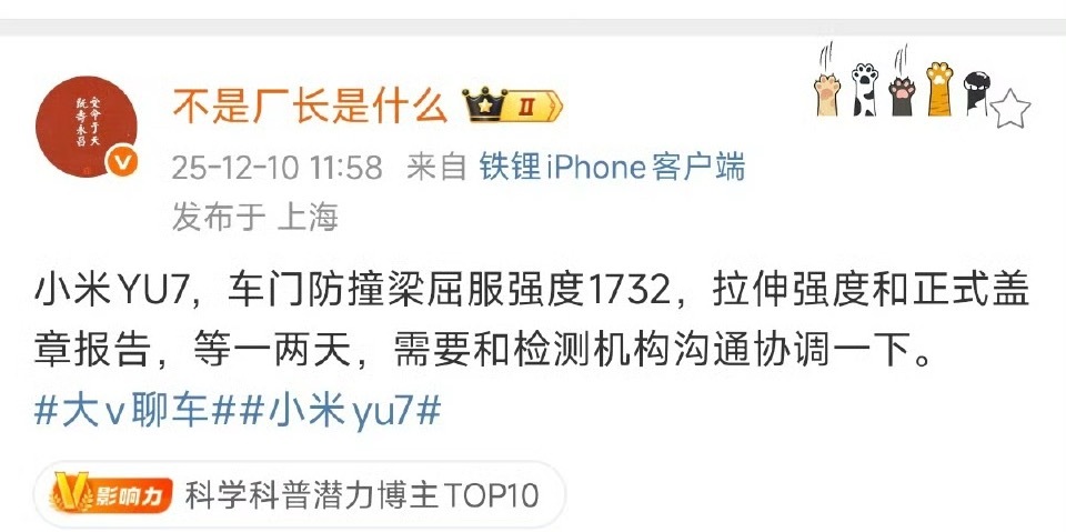 屈服强度(就是把金属拉变形/拉弯的力)。•别人: 我这根钢材,你用 1500 的力气才能把它打断。(这是常规优秀水平)小米: 我这根钢材,你用 1732 的力气,它甚至连弯都不弯一下。比一般核潜艇还要猛,卧草太牛逼了。小米真的低调的没边了