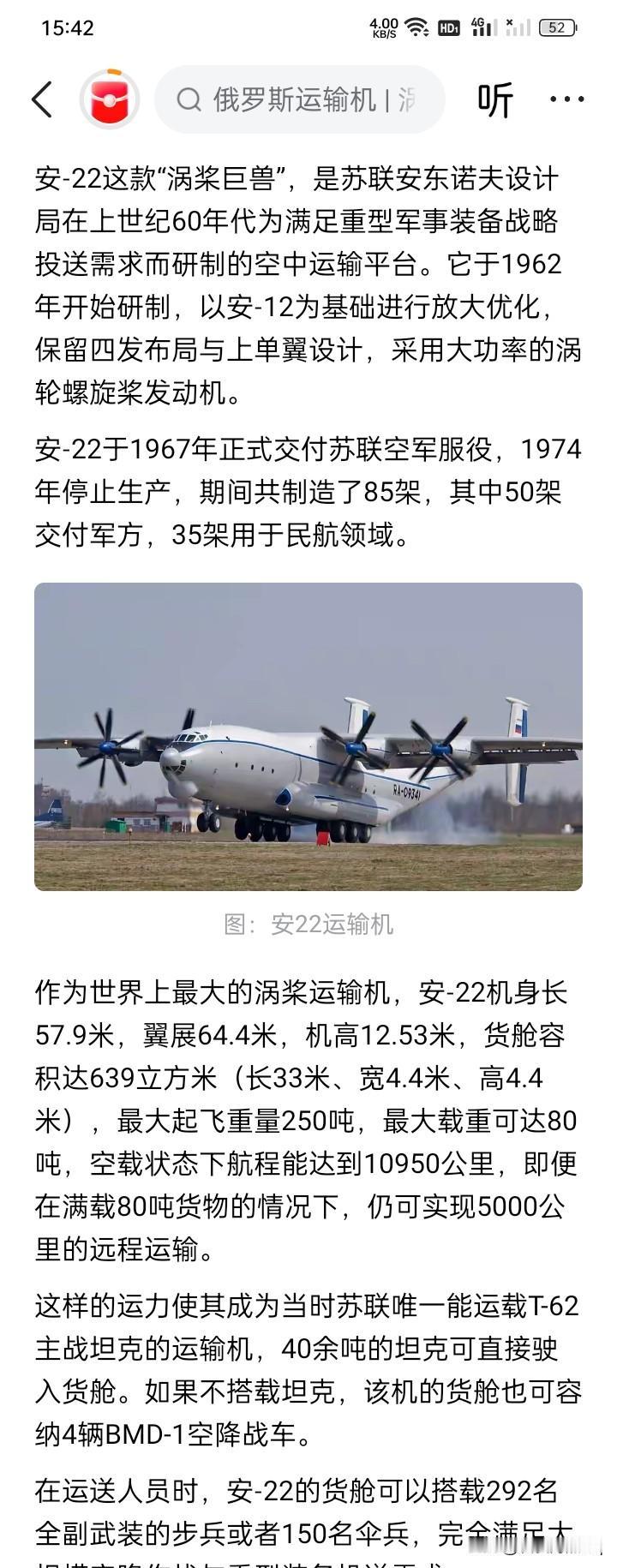 祸不单行? 刚刚有消息说俄罗斯的一架伊尔-76大型军用运输机在苏丹港机场起飞后不久坠毁,八名机组员人员很有可能已经全部丧生。又有消息转述俄罗斯方面的传闻说,在此的不久之前,俄罗斯的一架安-22重型军用运输机,在经过维修后,好像还是在进行试航的时候坠毁,七名机组人员似乎也随之一命呜呼。 据网络上的消息,安-22涡桨运输机是目前俄罗斯最大的运输机,但不知道是否属实。还有传闻说,这架在维修后试飞坠毁的重型运输机,是俄罗斯最后的一架安-22涡桨军用运输机。 虽然俄罗斯与乌克兰打的主要是地面战场上的战争,但在这场战争中的几年期间,俄罗斯损失的各种重大型军用飞机,似乎很多,对俄武装力量的总体打击也好像很惨重。