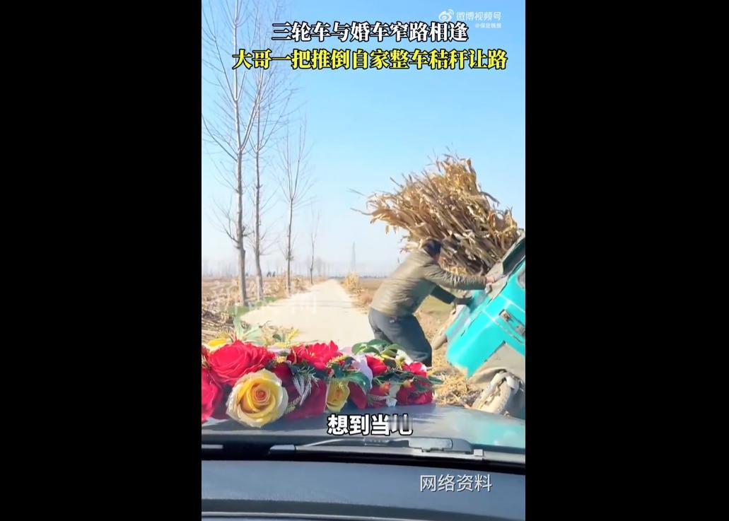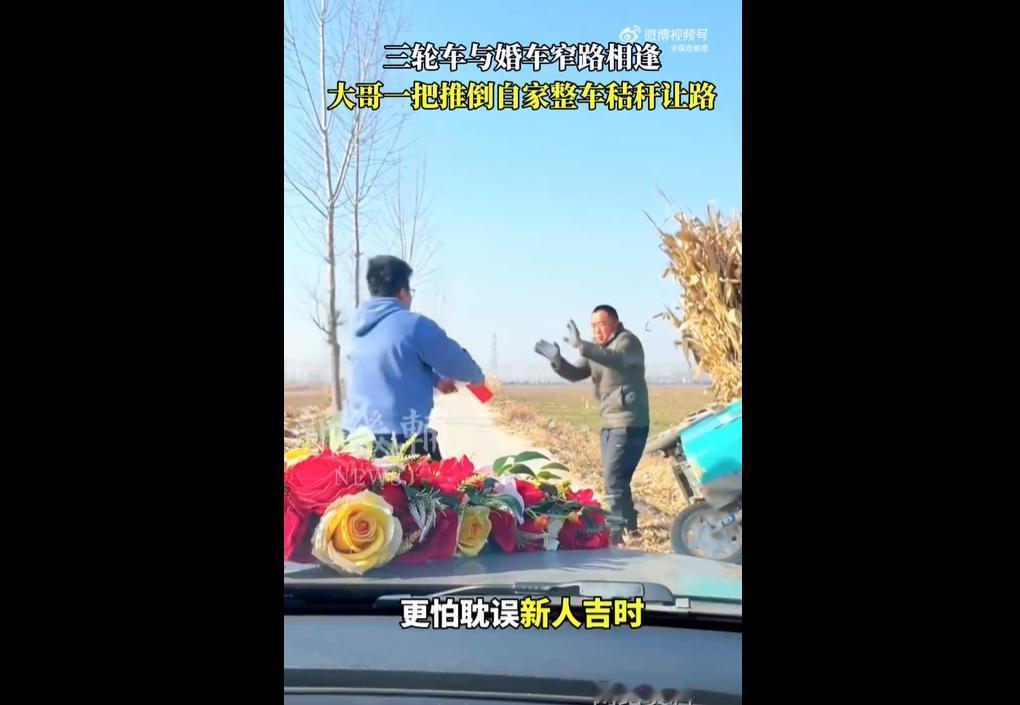 2025 年 12 月 6 日,济南三轮车司机张大哥满载秸秆行至窄乡道,与婚车队相遇。 因道路无法错车且当地有 “婚车不走回头路” 习俗,为不耽误新人吉时,他果断徒手推翻三轮车至庄稼地,甘愿承担车辆损坏、秸秆散落的损失。 新郎下车递红包致谢,张大哥起初婉拒,后为图喜庆收下并指挥车队通行,事件获新华社报道,网友盛赞,也有人指出其车辆或存在超宽问题。 张大哥这波操作,把 “成人之美” 玩出了真性情! 宁愿自己吃亏,也不砸新人的好日子,比那些拦婚车抢红包、躺地耍无赖的人渣强一万倍! 但别光顾着夸,车要是真超宽,那也是违规,不能因为善意就抹掉规矩,乡村道路设计得这么窄,也早该改改了! 再说这婚俗,“不走回头路” 本是图个好彩头,张大哥却把它变成了实实在在的善意,反观有些地方,婚俗早变了味,成了敛财的由头。 现在太多人遇事先算自己的得失,连举手之劳都要讨价还价,张大哥这股不带算计的实在,才是最难得的! 不过也得提醒,善意值得夸,但违规和道路问题也别回避,不然下次可能就不是 “一帆风顺”,而是出麻烦了!