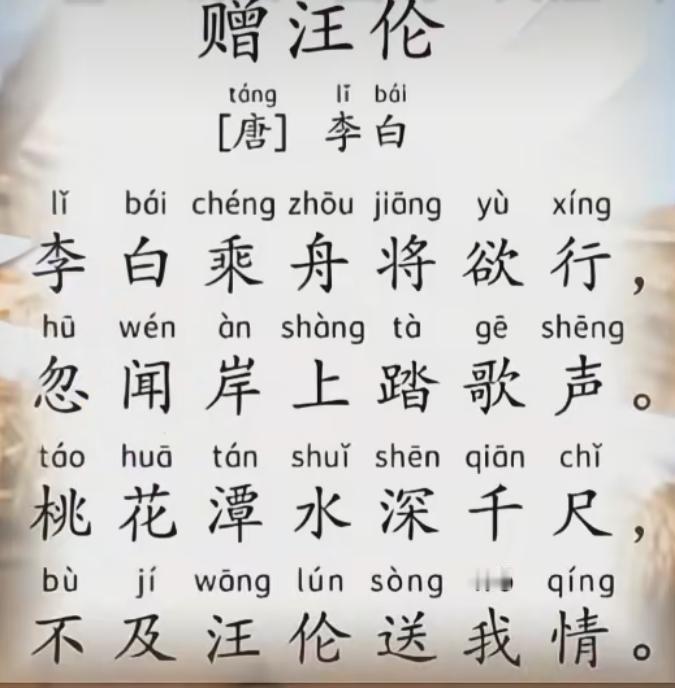 终于知道这首诗的意思了: 李白坐船刚要走, 听到有人喊喝酒。 管他河水深不深,