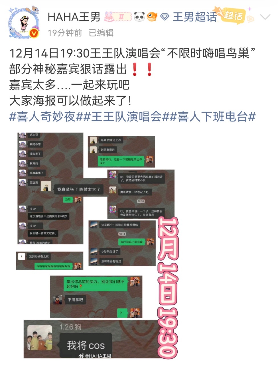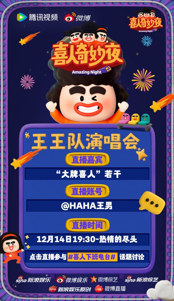 王王队演唱会官宣喜人奇妙夜 快乐续航!王王队演唱会定档12月14日 19:30,惊喜嘉宾阵容拉满,王广的 cos 更是让人期待值爆棚,坐等这场欢乐盛宴开演!