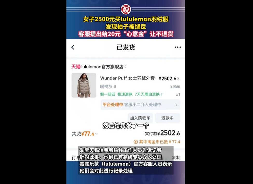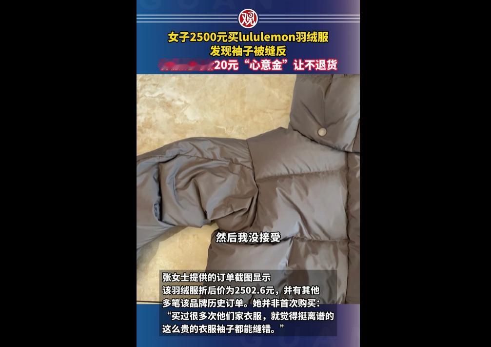 12 月 9 日,内蒙古呼和浩特的张女士在 lululemon 官方旗舰店,以 2502.6 元购得一件羽绒服,试穿时发现右袖被缝反。 作为品牌老顾客,她对此十分不满。客服先提给 20 元 “心意金” 让其留货遭拒,后同意退货但仅追加 100 元指定款代金券,未说明原因也未道歉。 目前天猫高级专员已介入,品牌客服称会记录处理。 张女士这波维权太该支持! 花两千五买件大牌羽绒服,结果袖子能缝反,换谁都得炸! 更难得的是她没忍气吞声,直接拒了那打发叫花子似的 20 元,硬刚品牌的敷衍,这股较真劲儿,比那些吃了亏只敢私下吐槽的人强太多! 但反过来想,这事儿也暴露了大牌的 “傲慢病”—— 品控能糙到袖子缝反,售后拿几十块钱糊弄人,连句正经道歉和原因说明都没有,真当消费者是冤大头? 之前这牌子就有退货难的槽点,现在品控售后双拉胯! 还好天猫介入了,希望能逼品牌给个说法,不然这大牌的脸面,迟早得被自己的敷衍败光!