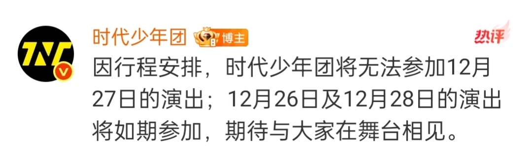 时代少年团新音极限行程时代少年团因行程安排,不参加12月27日的新音演出。26号