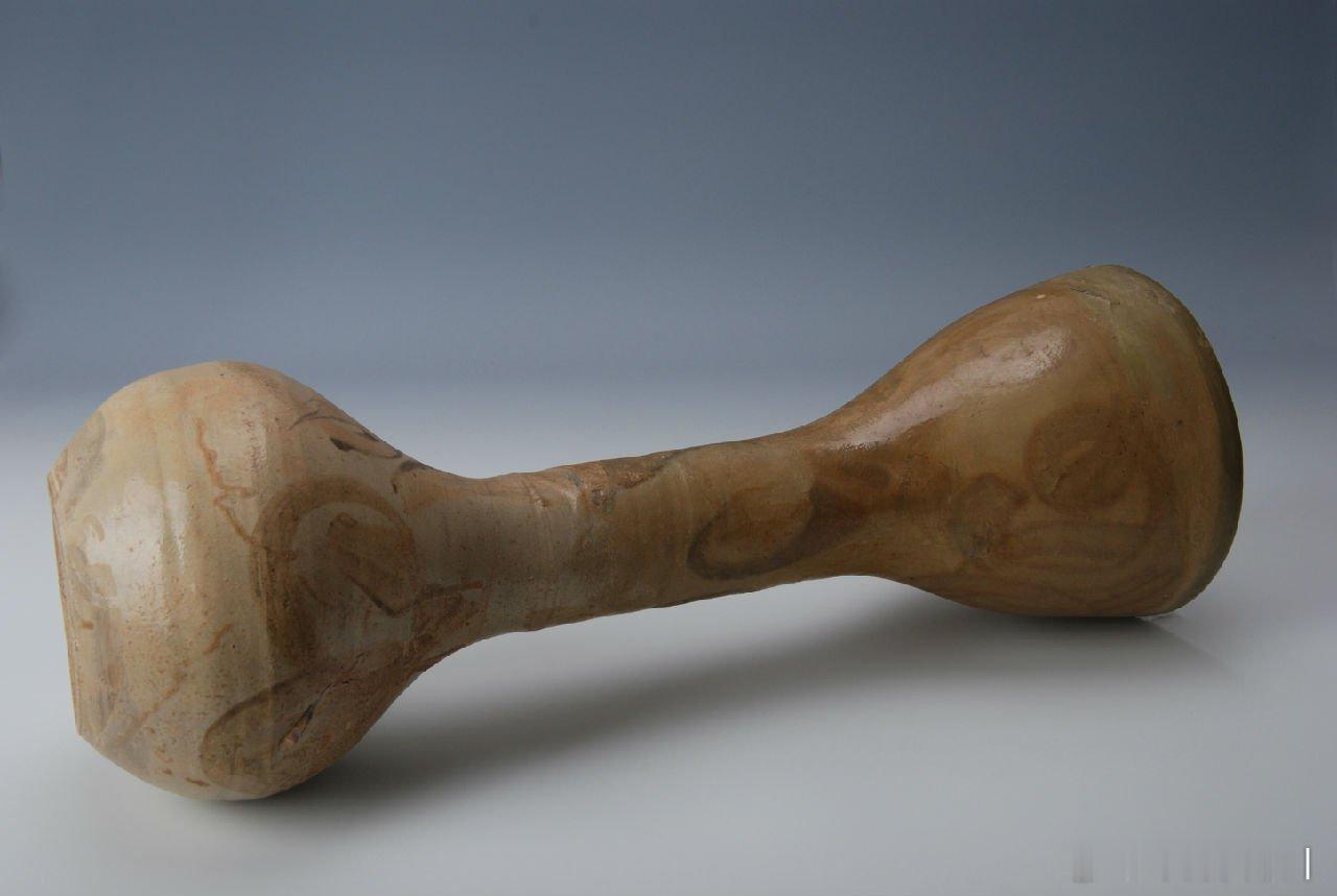 宋代岭南小蛮腰宋代永福窑青釉彩绘花腔腰鼓是一件融合音乐、工艺与民族文化的国家二级文物,1979年出土于广西永福县窑田岭窑,现藏于广西壮族自治区博物馆。其造型独特,腰身细长46.7厘米,一端呈球形,另一端为喇叭形,灰胎青釉上绘有釉下褐彩双螭纹与蜻蜓纹,纹饰抽象流畅,极具视觉冲击力。 此腰鼓源自西域,经丝绸之路传入中原,宋代广西窑工借鉴磁州窑、鲁山窑工艺,创新烧制成瓷质乐器,专用于壮族、瑶族的傩戏、祭祀及节庆活动。据《桂林郡志》记载,民间“吉凶事悉合乐,终夜击鼓不绝”,至今仍用于“永福阴笛乐”非遗演奏。演奏时以羊皮蒙住球端,通过勒紧腰身调节音高(定调G或D),喇叭口扩音远传,堪称古代“立体声音响”。 永福窑田岭窑曾出土百余件腰鼓残片,印证其大规模生产与外销盛况,不仅满足本地需求,更通过水路贸易出口海外,成为中原文化与岭南文化融合的见证。这件腰鼓以激昂鼓声跨越千年,再现了宋代广西民间“击鼓踏歌”的狂欢场景,是陶瓷史与音乐史上不可多得的瑰宝。