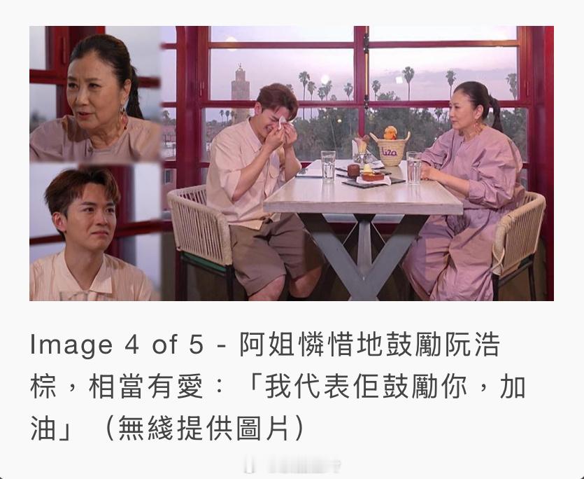 【明報即時】汪明荃化身「嫲嫲梁舜燕」 與阮浩棕遊摩洛哥 Nicholas淚流披面 阿姐與製作組製作阮浩棕與嫲嫲梁舜燕暢遊摩洛哥的AI旅行短片,阮浩棕見到後即哭成淚人。(無綫提供圖片)無綫綜藝節目《帶阿姐看世界》,於12月13日(周六)播出最後一集。昨晚(9日)是第二站摩洛哥最後一集,並引爆感人彩蛋。事緣在整個旅程中相處恍如兩嫲孫的汪明荃(阿姐)及阮浩棕(Nicholas),在行程最後互送禮物環節,阿姐與製作組偷偷地為阮浩棕製作了一條他與嫲嫲梁舜燕暢遊摩洛哥的AI旅行短片,還附帶一番感人的話:「你成日話遺憾冇帶嫲嫲一齊去旅行,我𠵱家畀個機會你同佢去旅行」、「我哋特別做咗條片,希望你留意嫲嫲講咗啲咩。」片段中,阿姐化身「梁舜燕」與阮浩棕在不同景點打卡,AI短片中,還出現梁舜燕的聲音:「好開心,I Love You」,相當感人。出名孝順的阮浩棕,看完影片後哭成淚人,阿姐見狀即憐惜地鼓勵他,相當有愛:「我代表佢鼓勵你,加油」、「你𠵱家只係10年,10年只係一個開始,希望你更加成長,將你嫲嫲嘅精神發揚光大啦。」阿姐還透露接拍《帶阿姐看世界》的真正目的,是希望鼓勵老友記多點外出走走,擴闊眼界:「我想透過呢個節目鼓勵啲長者,有啲地方未睇過嘅、好珍貴嘅,就要同啲仔仔女女、孫呀帶埋佢哋(一齊去),會好開心,同埋可以增進了解。」阮浩棕聞言和應確是回憶及得益滿滿:「真係會知道長輩更多人生經驗、同一啲佢哋身上發生過嘅事。」阮浩棕整個拍攝行程,最被震撼到的是阿姐的專業精神:「阿姐你真係好勁,因為今次我哋成個旅程真係好熱啦,然後好多好多車程,都會擔心阿姐你應唔應付到,但你嘅敬業樂業,令你真係頂到落去。」阿姐聞言則淡然回應:「我應承咗做嘅嘢一定要完成嘅,同埋做咗呢行咁耐,你知道你Hea啲又係要拍,認真都要拍,不如做好佢啦,係一定要做好佢。因為咁難得嚟到呢度,咁多人力物力去做一個節目,我諗啲觀眾都會感受到我哋嘅誠意嘅。」(即時娛樂)