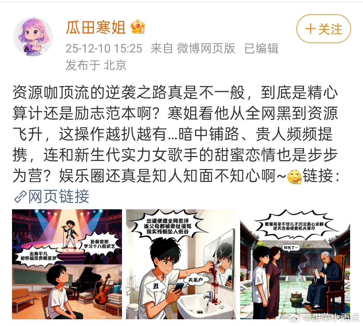 漫画家张小寒又出山了,看看这是什么乐子?1️⃣平凡出身唱跳出道被说是关系户被🐴稠2️⃣母亲带他找人逆天改命…资源飞升事业开始好转3️⃣公益活动这位顶流与女歌手“结缘”想借此更上一层楼…大家觉得这是画的是谁啊?