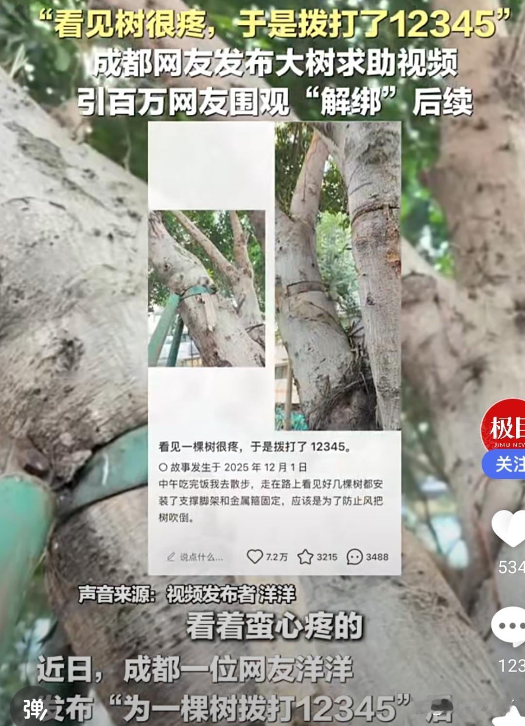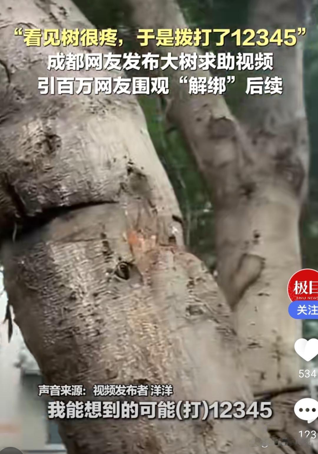 为一棵树拨打12345 引百万网友围观! 近日,成都一位网友发布大树求助视频,“看见树很疼,于是拨打了12345”,引百万网友围观“解绑”。 网友:这人太善良,点赞[强][强][强]