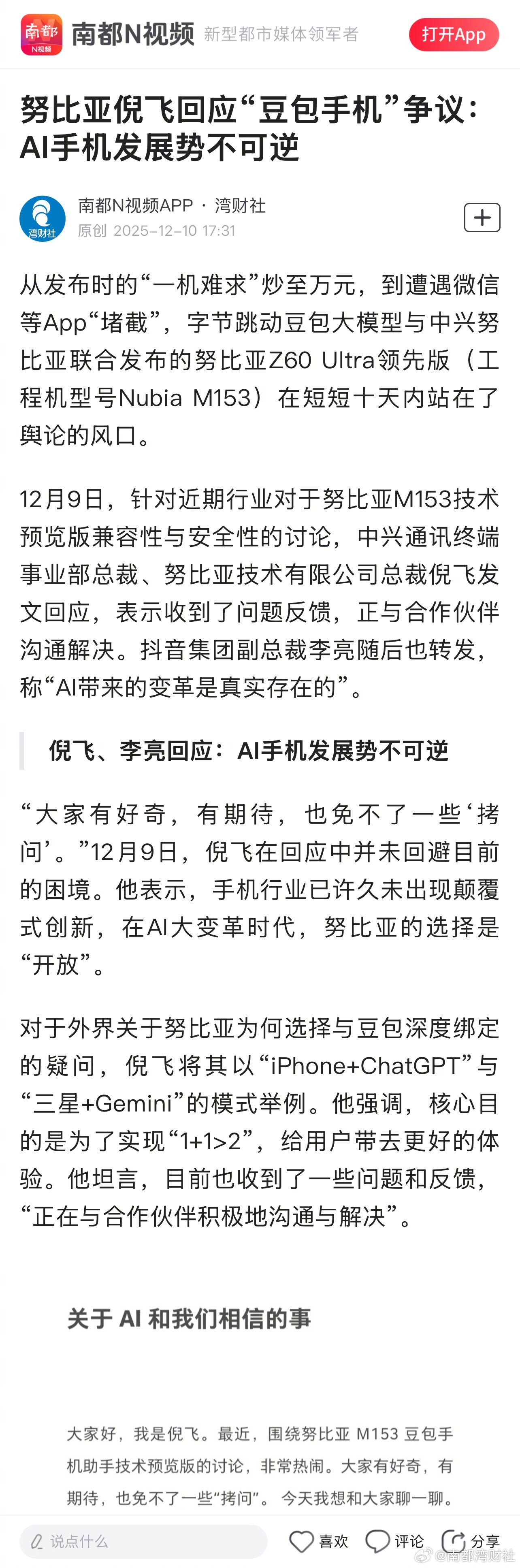 #豆包手机争议未平#【努比亚倪飞回应“豆包手机”争议:AI手机发展势不可逆】从发布时的“一机难求”炒至万元,到遭遇微信等App“堵截”,字节跳动豆包大模型与中兴努比亚联合发布的努比亚Z60 Ultra领先版(工程机型号Nubia M153)在短短十天内站在了舆论的风口。12月9日,针对近期行业对于努比亚M153技术预览版兼容性与安全性的讨论,中兴通讯终端事业部总裁、努比亚技术有限公司总裁倪飞发文回应,表示收到了问题反馈,正与合作伙伴沟通解决。抖音集团副总裁李亮随后也转发,称“AI带来的变革是真实存在的”。