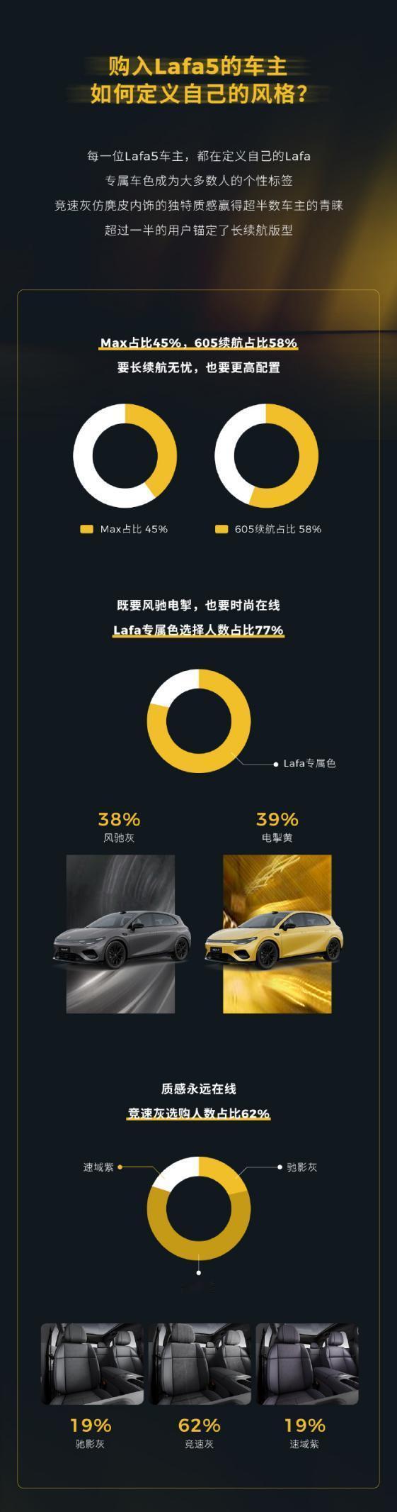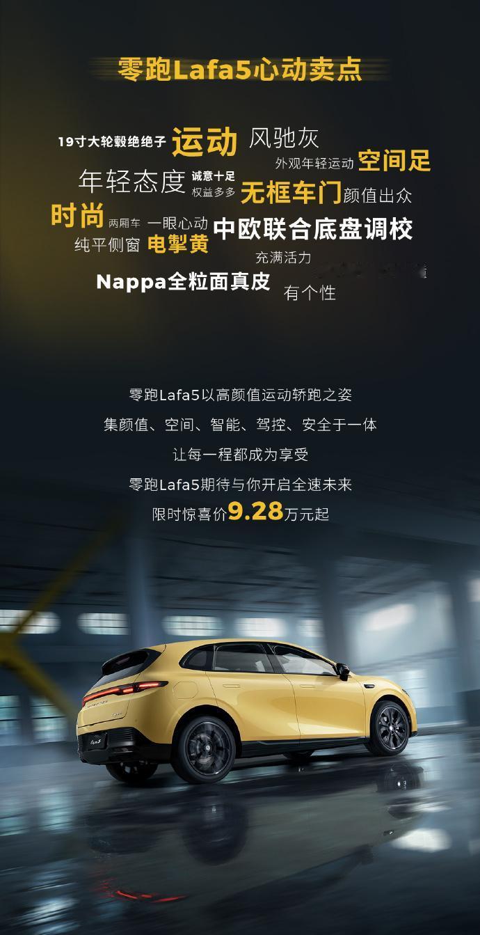 零跑Lafa5车主画像出炉:90后车主超半数,女性车主占比近半。 日前,零跑公布了Lafa5首销期车主画像。数据显示,在首批下定车主中,35岁以下车主占比达53.86%,意味着超过一半为90后群体,深得年轻人喜欢。同时,女性车主比例显著提升,达到48%,创下品牌新高。看来,女性车主也很喜欢Lafa5。 从城市分布来看,一线和新一线城市的Lafa5车主占比40%。个性化选装方面,竞速灰仿麂皮内饰选择率最高,达62%;包括风驰灰、电擎黄专属配色,选购人数占比也达到77%。多项数据都足以表明,Lafa5正逐步成为都市年轻人的时尚单品。 Lafa5自上市以来便受到年轻人青睐,与其鲜明产品定位密切相关。Lafa5全系标配无框车门、19英寸运动轮毂,更有宽体轿跑姿态与个性配色,年轻化、运动感十分突出。同时,Lafa5续航达605km,更有8650+8295P双旗舰芯片+激光雷达端到端,品价比可以说顶到天了,所以上市3天时间,销量就突破7000台。 若有意向购入Lafa5,建议近期尽快锁定权益。毕竟这会儿9.28万起限时惊喜价,仅持续到本月底,二来明年购置税政策退坡,月内入手无疑为最佳时机。零跑Lafa5 零跑汽车