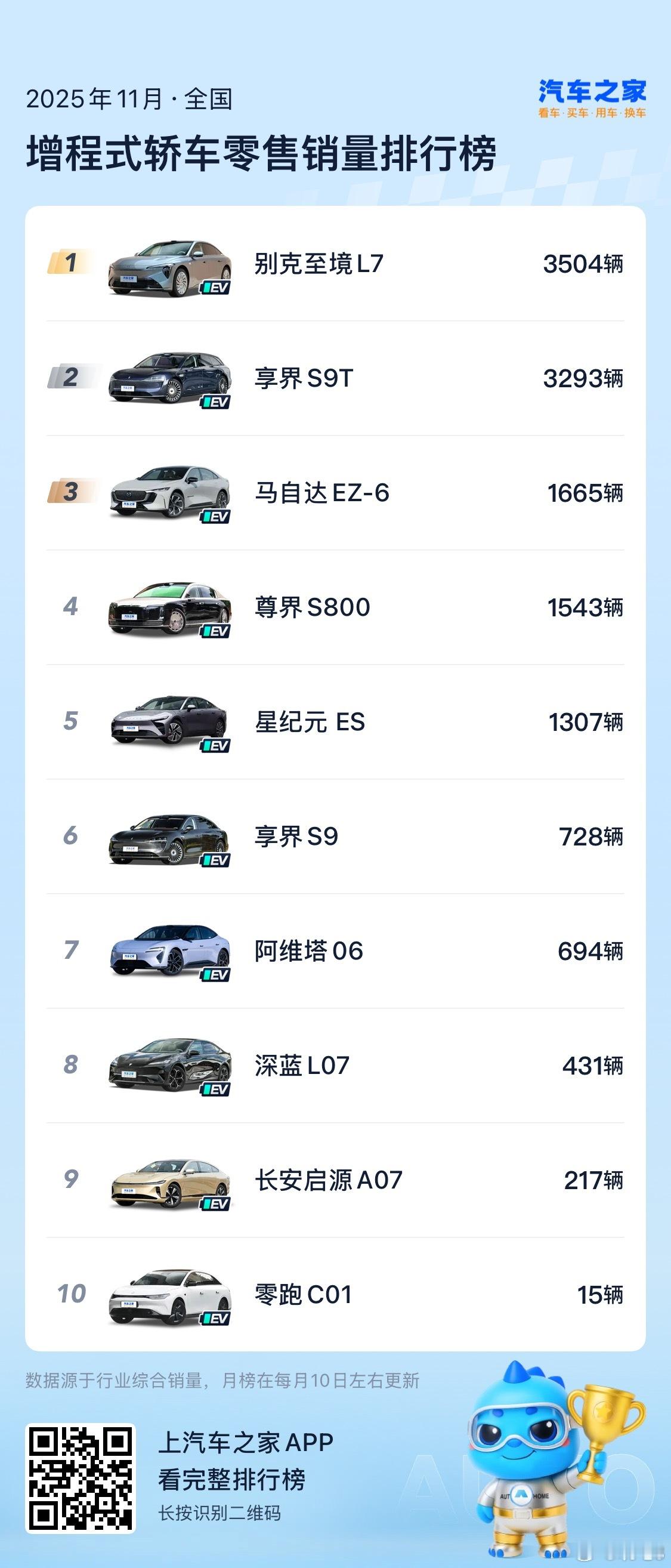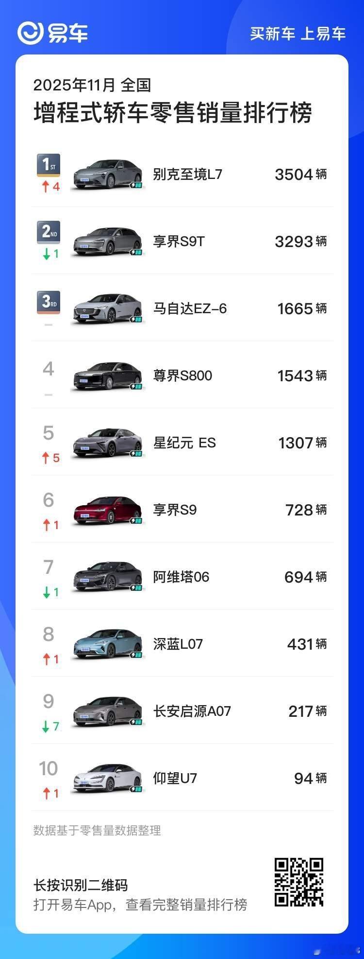 增程轿车 的市场还有很大的增长空间现在排前三的是别克至境L7,享界S9T,马自达 EZ-6