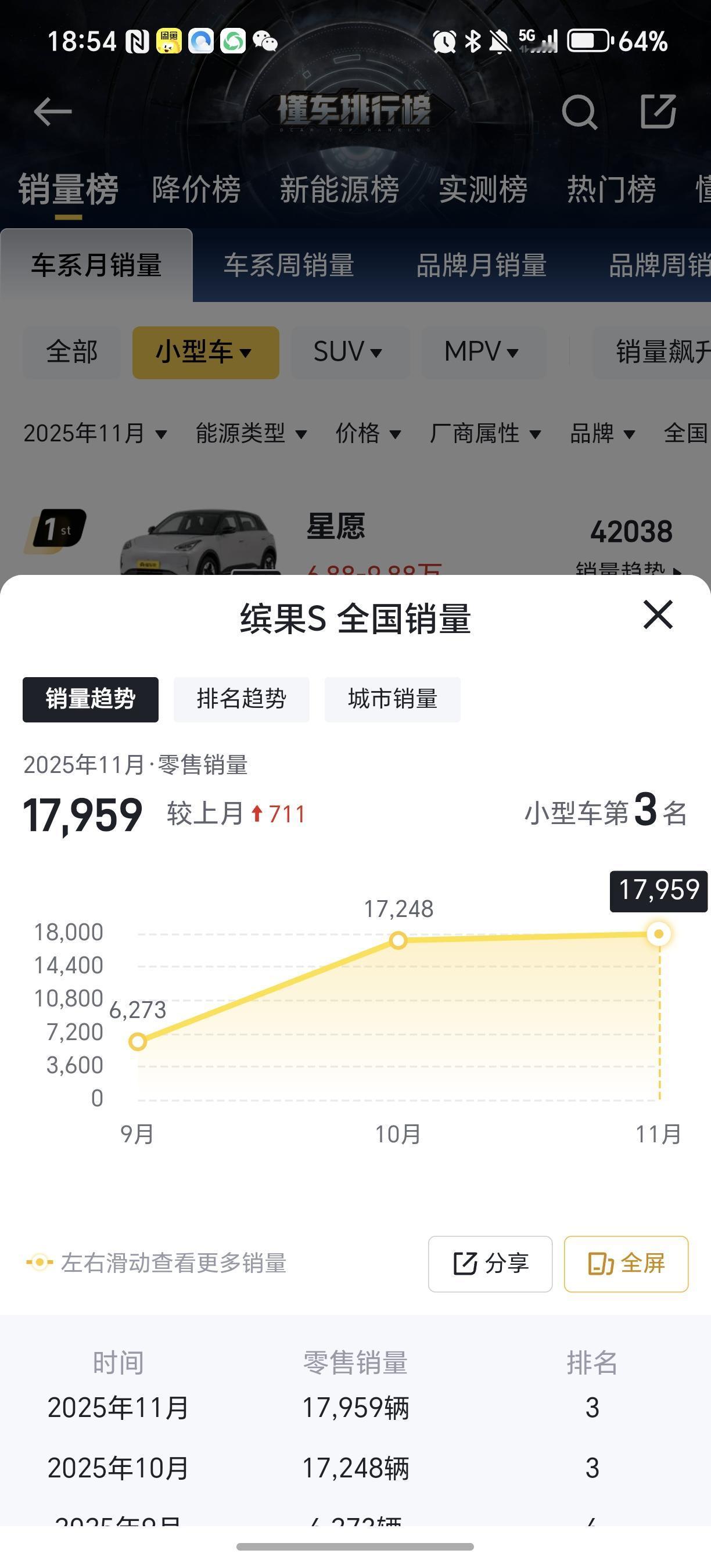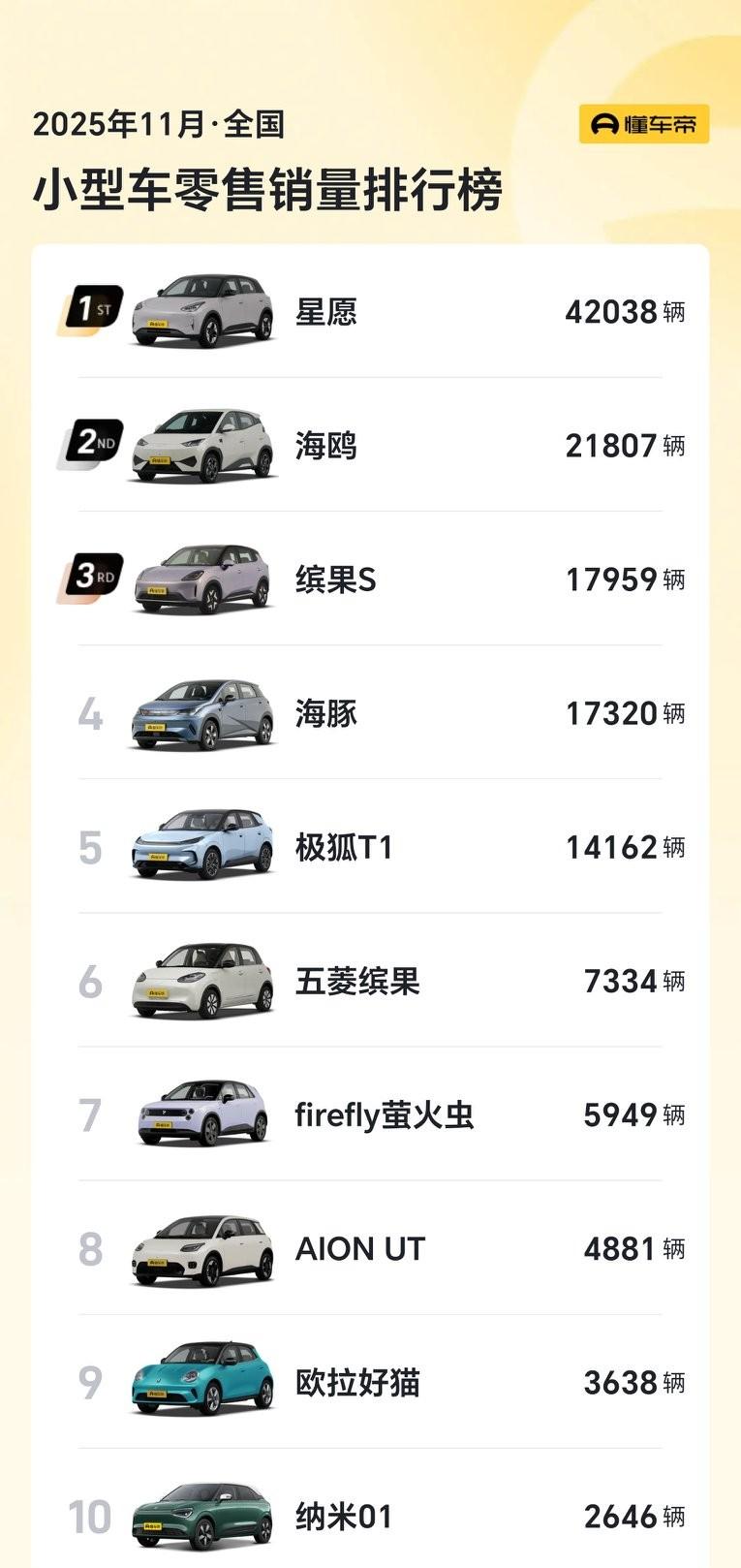 太牛了! 9月,缤果S销量0.63万辆 10月,缤果S销量1.72万辆 11月,缤果S销量1.8万辆 2025年,上汽通用五菱推出的小型纯电车缤果S上市后销量持续上涨,最近两个月销量均超过1.7万辆,国内销量超过了比亚迪海豚。 缤果S入门版续航325公里,最大续航430公里。 座舱也还不错,配有8.88英寸仪表+12.8英寸2K中控屏,搭载DeepSeek大模型灵语AI,语音响应快,还支持多种方言。 缤果S补贴后起售价仅需6.38万元起,还是相当不错的一款小车。