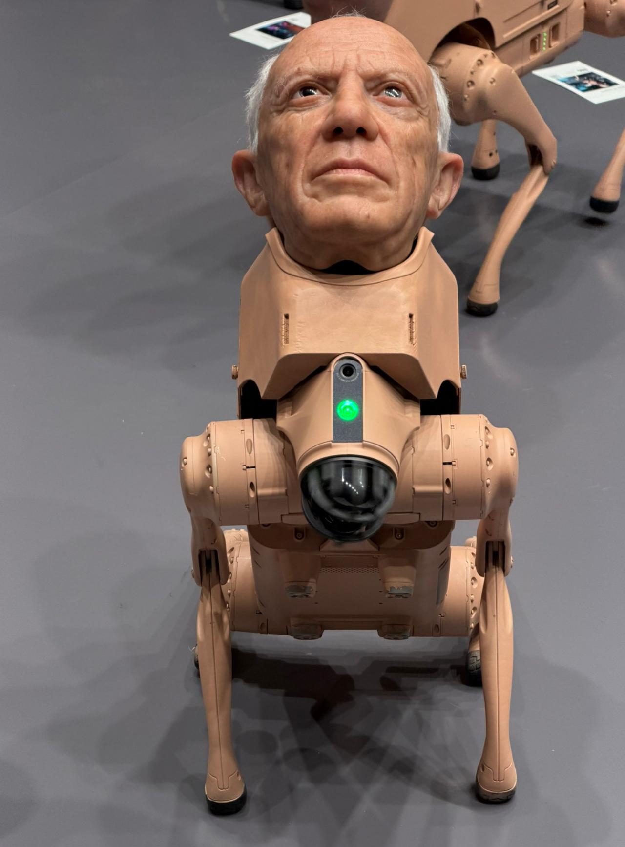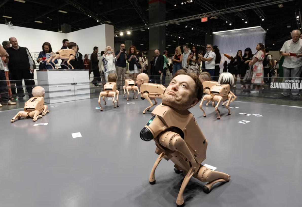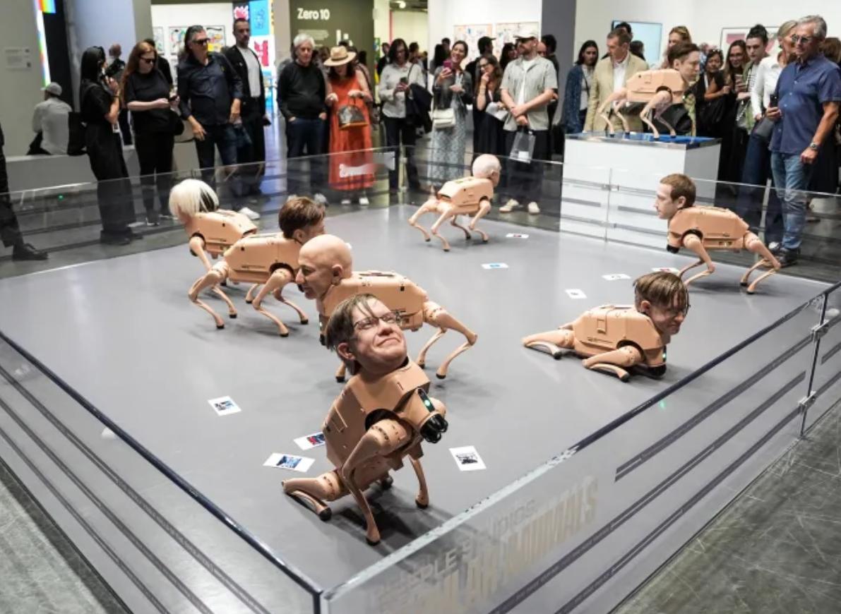 2025 年迈阿密巴塞尔艺术展上,数字艺术家 Beeple(真名 Mike Winkelmann)的装置作品《普通动物》成为全场焦点。这组作品以波士顿动力风格的四足机器人为基底,通体覆盖肉粉色材质,头部佩戴超写实硅胶面具,精准复刻了马斯克、扎克伯格、贝佐斯等科技巨头,毕加索、沃霍尔等艺术大师及 Beeple 本人的面容,细节逼真到每平方厘米 1800 个毛孔,还能通过皮下液压系统模拟眨眼、挑眉等微表情,诡异感十足。 作品最具争议的是独特的 “排泄” 功能:机器狗通过头部 4K 摄像头捕捉环境与观众,经 AI 算法处理后,按对应人物风格重构图像,再由尾部打印机 “排出” 实体照片。马斯克款输出黑白科技风图像,扎克伯格款带元宇宙赛博感,毕加索款呈现立体主义,而贝佐斯款被特意设定为 “只看不拉”,暗喻其仅凭影响力就能塑造大众认知。Beeple 直言创作初衷:“过去人类通过艺术家的眼睛看世界,现在科技巨头掌控算法,决定我们所见内容”,标题《普通动物》则隐喻人类在技术驯化下沦为被动接受信息的 “生物”。 尽管充满尖锐讽刺,7 只机器狗仍以每只 10 万美元(约合 70.8 万元人民币)的价格,在预展期间被私人藏家一扫而空,现场 “排泄” 的印刷品也遭疯抢,部分还附带 NFT 兑换二维码。这形成奇妙闭环:批判资本与科技霸权的作品,本身成为资本追捧的奢侈品。 作品也引发热议,国内网友质疑其涉嫌侵犯肖像权、收集生物信息,但美国法律对社会批判类创作的侵权认定门槛极高。Beeple 强调创作 “不针对个人,而是反思科技霸权”,这种荒诞的解构方式,让观众在视觉冲击中产生对权威的微妙反抗感,比单纯的文字批判更具力量。