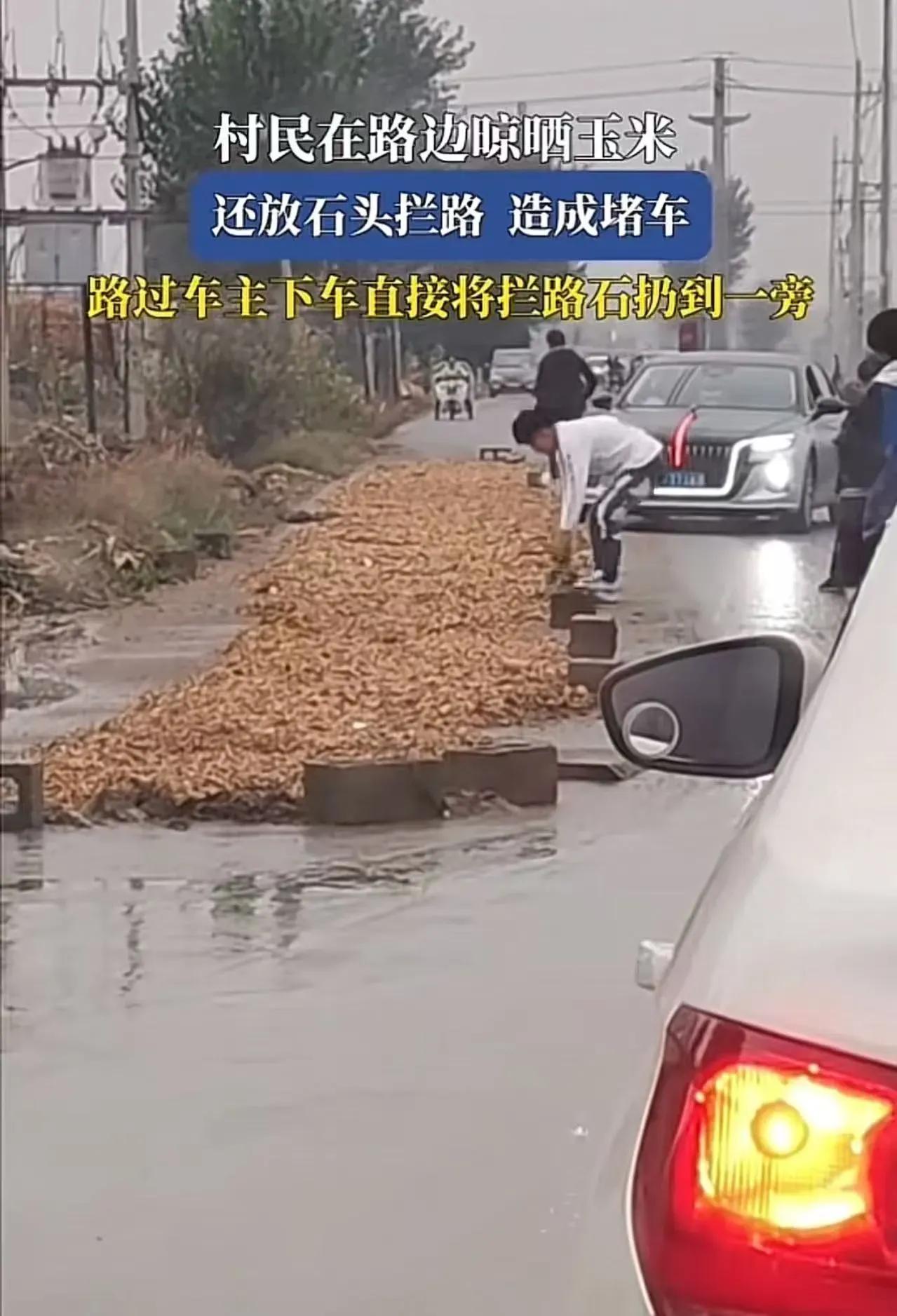 “这个小伙火了!” 在一条乡村的水泥路上,一边是铺得满满当当的玉米,一边是一长串排队的车,就这么僵在那儿。有人拿起手机拍下全过程,往网上一放,炸了。 事情并不复杂。 村里没像样的晒场,家家户户一到秋收,就只能往路上铺。水泥路平整,风一吹就干得快,谁都想赶在天变之前把粮食收好。 可这条路本来就不宽,村民又怕车压着玉米,就干脆在路中间横了一排石头,硬生生拦出一条“禁行区”。 车子多的时候,只剩半条路在那儿挤。你让我,我让你,车头对车头,谁都不敢往前顶。后面电动车、三轮车跟着排队,稍微有一个心急的往里一钻,整条路马上就锁死。 拍视频的那个小伙,正好开车路过。 他一看前面这阵仗,熄火等了一会儿,发现根本走不动,人一下就炸了。 在他眼里,公共道路就是公共道路,不是谁家的院坝。晒玉米可以理解,把整条路卡成这样,就有点说不过去了。 小伙子干脆一脚踢开车门,气冲冲走到路中间,一块一块把石头抱起来,直接扔到路边。 石头没了,车队立刻动了。可代价也来了——一辆接一辆从玉米上碾过去,金黄色的玉米被压得七零八落,壳仁乱飞,满地狼藉。 这一幕,被完整地拍了下来。 视频很快冲上热榜,评论区吵成一片。 有人心疼农民,说得直白:“一年就指望这点粮,晒个十来天都不行吗?你们车多排几分钟队怎么了?再怎么说,先得让种地的人活下去吧。” 也有人补了一句: “现在农村很多晒玉米的都是老人,儿女在外打工,这几袋玉米就是他一年的油盐钱、看病钱。看着被车压成那样,谁受得住?” 还有人把矛头对准小伙子:“可以跟村民协商,可以找村干部协调,把石头搬一搬,把路整理一下,有必要非得让所有车从玉米上面碾过去吗?这不是解决问题,这是泄愤。” 可另一边的声音也很响: “道路就是道路,不是晾晒场。哪怕是村道,也要讲规矩。你今天可以铺玉米,明天是不是有人可以堆砖、倒砂石?都想占一点,最后谁也走不了。” “理解农民,不等于什么都可以。占着公路晒粮,遇到救护车、消防车怎么办?真出事了,谁负责?” 还有人说,看评论更后怕:“如果大家一边又一边地劝‘就让一让吧’‘就理解一下吧’,久而久之,不守规矩倒成了有理的,守规矩的人反而像是没人情味,这就怪了。” 吵到最后,很多人都在问:到底谁错了? 在我看来,这件事很像一面镜子。 一面照出农村现实——不少地方没有专门的晒场,老晒场被挤占、被改作他用,路成了村里最大的空地。一到收粮季,路边,到处都是摊开的玉米、稻谷、花生。 另一面照出规矩的空档——村民习惯了“大家都这么干”,觉得只要不出大事就行,真正碰上通行矛盾,才发现谁也说不清哪里是边界。 但就算现实再难,公共道路也真不能当自己家的坝子用。 路,是大家的命脉。有人赶集,有人拉货,有人送孩子上学,还有人可能在车上拉着病人去医院。只要有这种可能,就不能把整条路当自己家的晒坪。 反过来看,小伙子的做法也谈不上完美。 他看到的,是自己被堵在路上的那股憋屈。 没看到的是,那一地玉米背后,是一整年的日出而作、日落而归。 跟村民理论,找村干部协调,把石头挪一条通道出来,让车慢慢单向通行,其实都有余地。 直接掀石头、放车碾粮,虽然出了口气,却把事推向了最激烈的一步。 这一头是粮,一头是路,中间缺的,其实是“提前说清楚的规矩”。 村里要不要划出固定晒场?村道能不能设一个“农忙临时晒粮区”,标好范围、时间、留出应急通道?乡镇和村委会不是旁观者,该把话说在前面。 把规则立住,把路划清,村民心里有数,就不会谁家抢谁家位置,也不会一铺铺到整条路。 对村民来说,尊重规则,不是吃亏,而是保护自己。一旦发生事故,有明明白白的制度在前面挡着,不至于所有责任都压在一个老人的肩上。 对过路的人来说,遇到这种情况,少一点戾气,多一点沟通,可能会更有力。 你可以拍视频,可以投诉,可以要求整改,但别让怒火把别人的一年收成当成发泄的出口。 粮食是命。通行权也是命。 公路不是谁家的私人院子,晒出来的每一粒玉米,也不是随便可以碾碎的东西。 最好的结果,不是看谁压过谁,而是——路上还有宽宽的一条道,路边还有一块安心的晒场,车能走,粮也能晒,谁的脸上都不挂火。 这,才是我们真正希望看到的乡村画面。