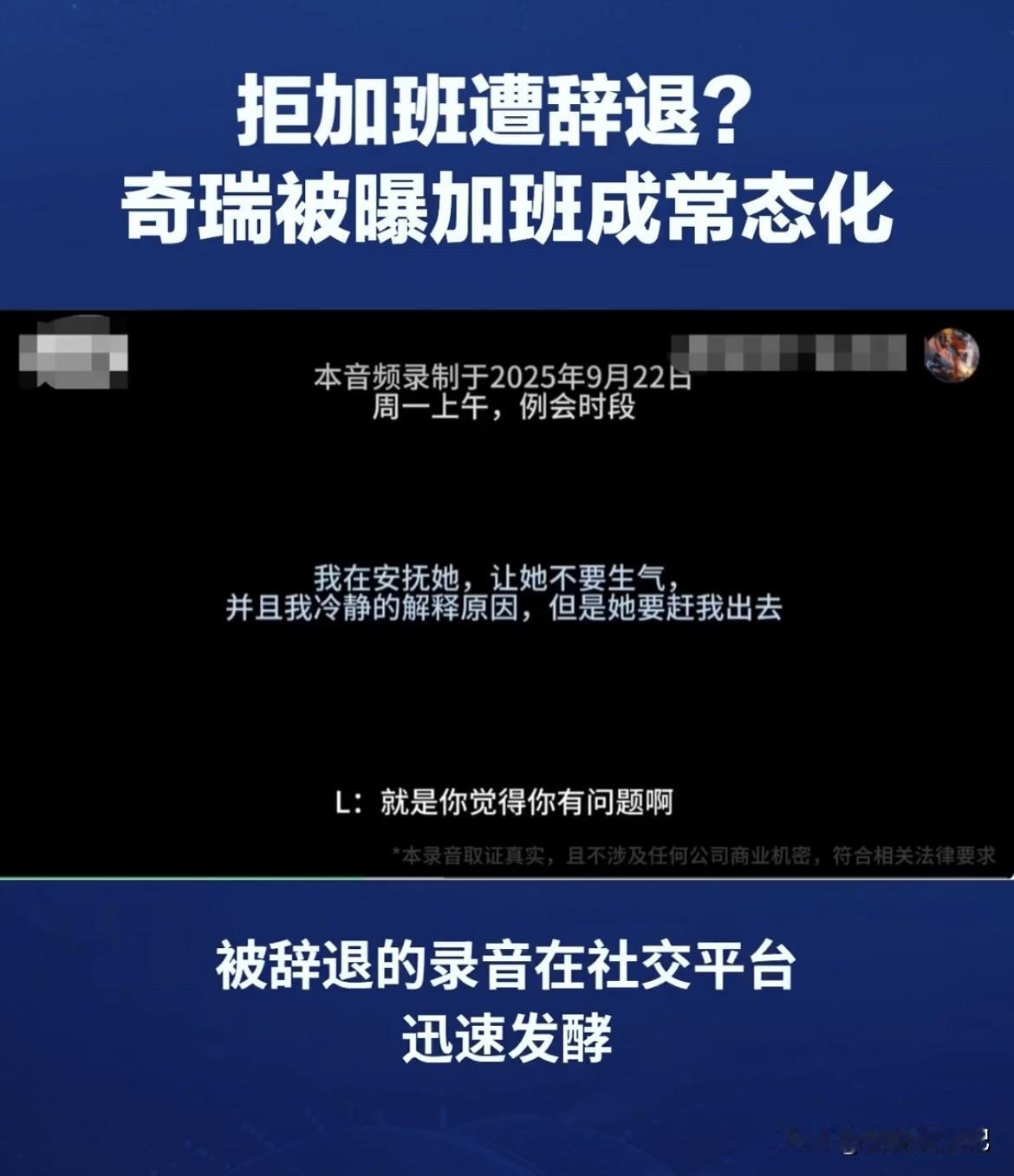 最近奇瑞被爆加班成常态,还有拒绝加班被辞退的录音曝光了。 现在很多公司都这样,把加班当成理所当然。就像录音里体现的,员工拒绝不合理的加班要求,竟然就被辞退,这也太过分了。 员工不是机器,也需要休息。长期加班不仅影响员工的身心健康,还可能降低工作效率。企业应该合理安排工作任务和时间,而不是一味地让员工加班。希望奇瑞能重视这个问题,别寒了员工的心,也给其他企业做个好榜样,别再搞这种不合理的加班文化了。