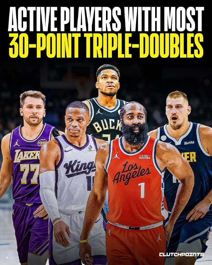 现役球员30+三双次数排名: 1、东契奇——49次 2、约基奇——48次 2、威少——48次 4、詹姆斯——47次 5、哈登——37次 6、字母哥——25次 7、杜兰特——6次 8、恩比德——5次 8、小萨博尼斯——5次 10、巴特勒、阿夫迪亚——4次 从字母哥的25次之后,直接有了断档的差距。 在字母哥前面的5个人,东契奇、约基奇、威少、詹姆斯、哈登,就几乎是联盟公认的三双达人,这5个人也都是NBA历史三双榜前10。 其中,威少目前以207次三双高居历史第一,也是目前唯一突破200次三双的球员。