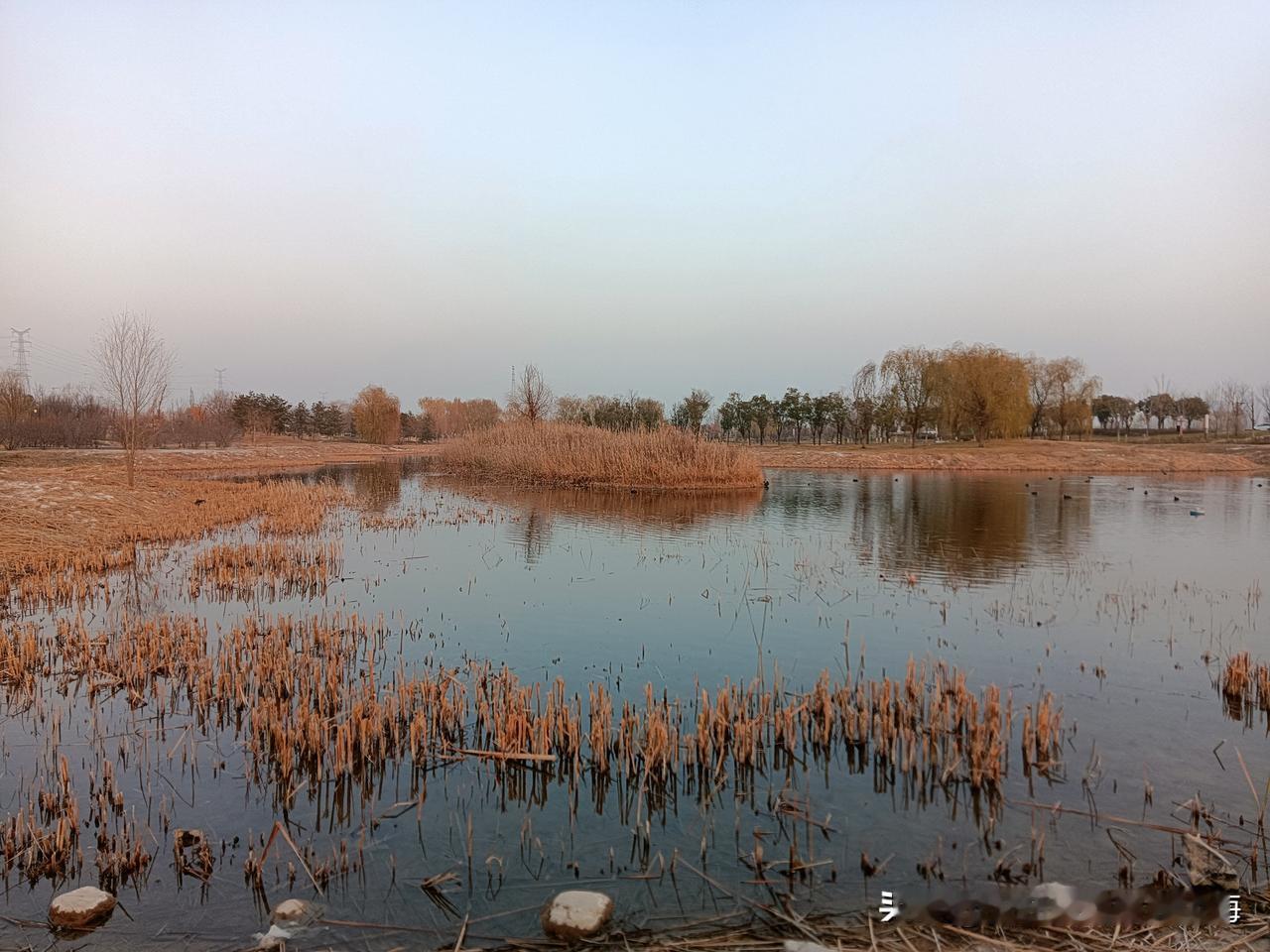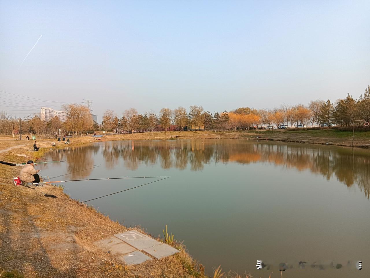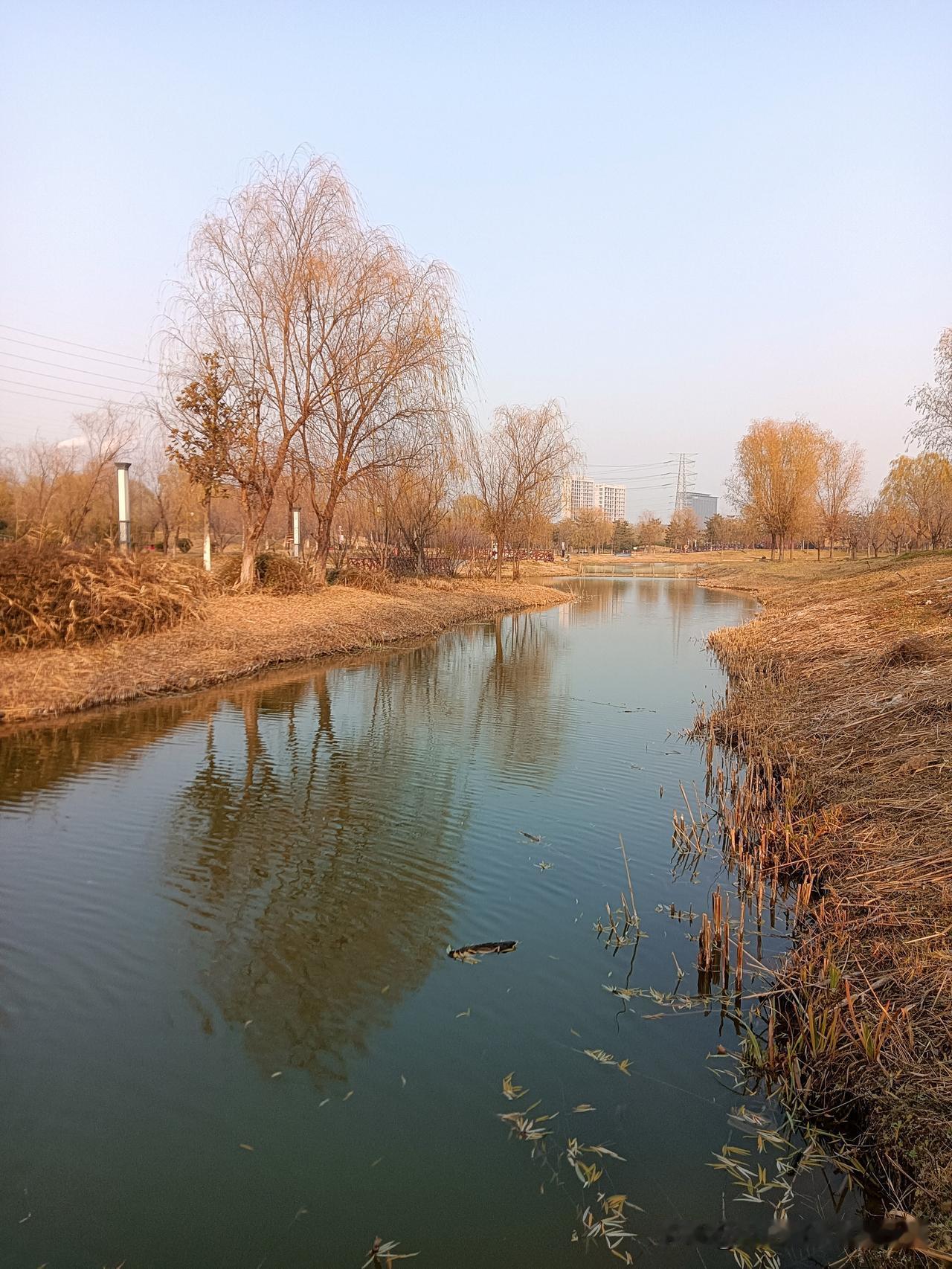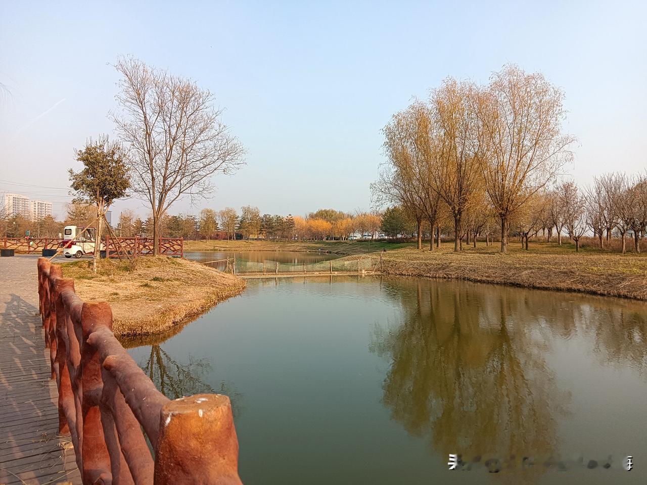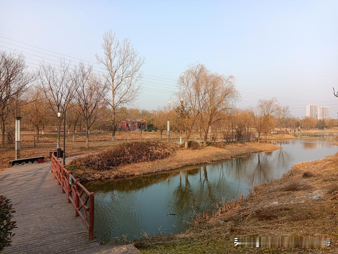 朝我这儿看,这里是咸阳的秦汉新城渭河湿地公园,一个离地铁14号线秦宫站很近的自然生态区!公园面积还是挺大的,但却是一个一应俱全有丰富容量的绿地园林!我来过两次,分别是夏季和秋季,但在深冬时节来还是第一次!别看现在已经是12月的天,但暖阳下幽静的公园湖岸边还是少不了钓鱼者,还有那个长长的木制栈桥你走一走很有一番情趣!渭河生态景观带 咸阳公园 秦汉新城区