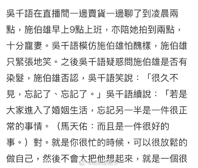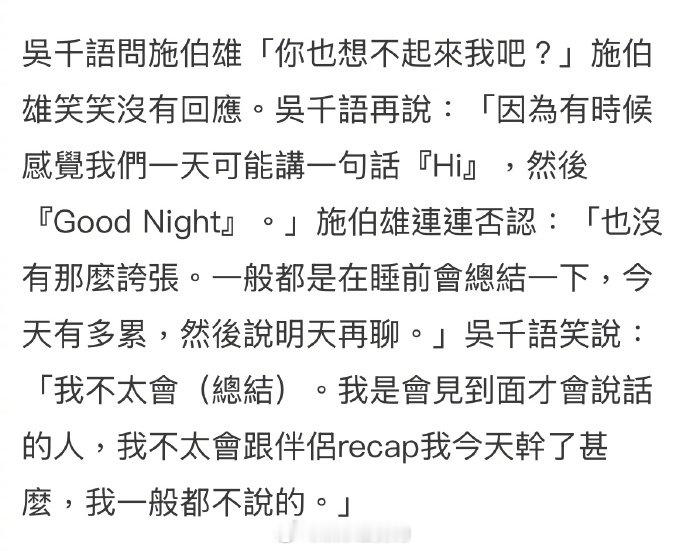吴千语称婚后会忘记另一半 吴千语谈婚姻生活 吴千语谈婚姻松弛感!直播中称“步入婚姻会忘记对方很正常”,解释专注自我时不用惦记反而舒服。当被问施伯雄是否也想不起她,他慌忙否认,并分享两人睡前会简单总结一天的温馨细节~