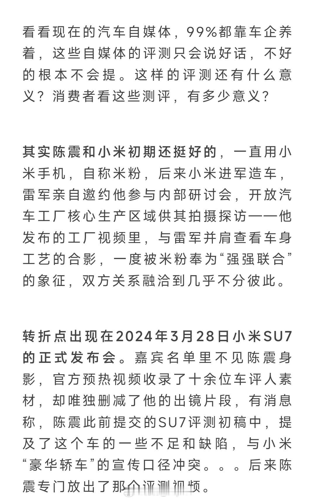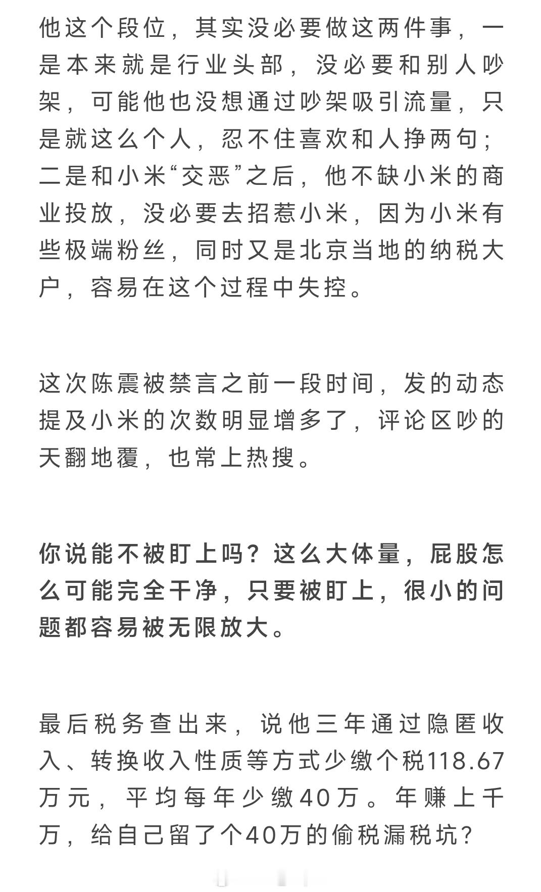 刷到民航圈头部大V 还在洗陈震,全文太乐了“他没想通过吵架吸引流量,只是忍不住喜欢和人争两句”“不缺小米商业投放,没必要招惹喜小米,因为小米有极端粉丝”“主观上陈不太可能故意逃税避税”“他这点税额没了就没了”“陈震是比较强势的乙方,可以选择不跟哪个车企合作”“现在的汽车自媒体只会说好话,测评没意义”,“陈震相对真性情”所有句子叠在一起简直炸裂