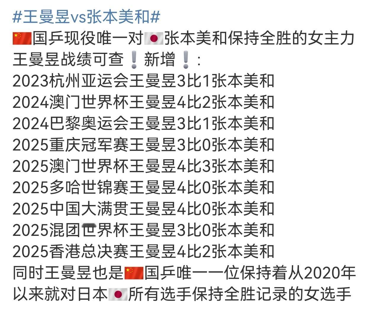 王曼昱4比2胜张本美和 祝贺!WTT香港总决赛女单,王曼昱又赢了张本美和,这是短时间内王曼昱跟张本美和的再次交手。比分是:11-6、11-8、11-13、11-6、9-11、11-7。