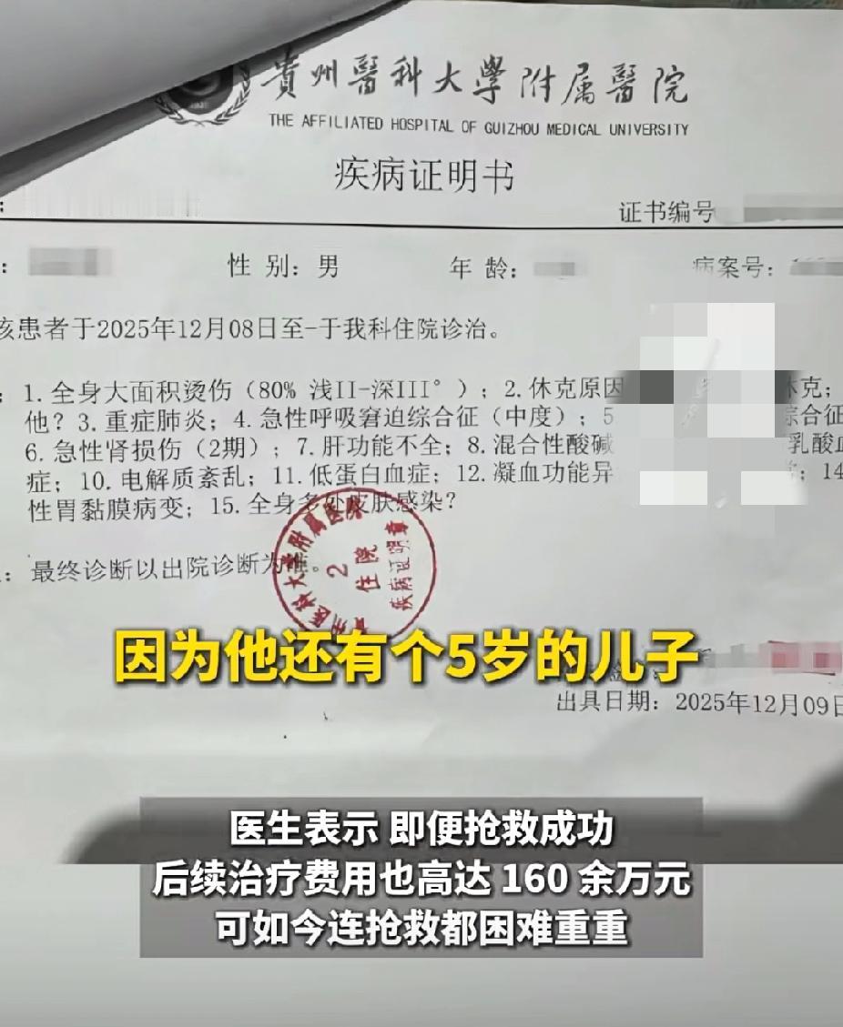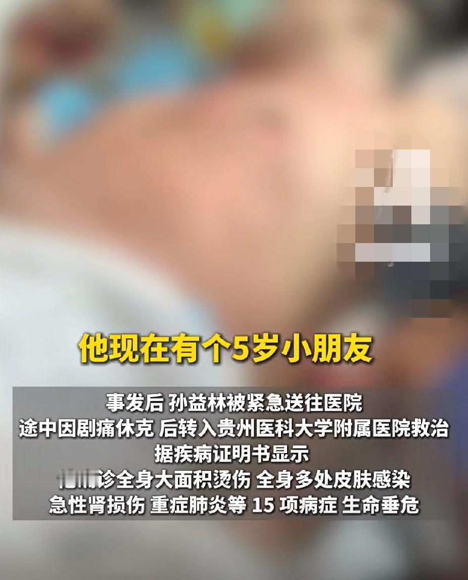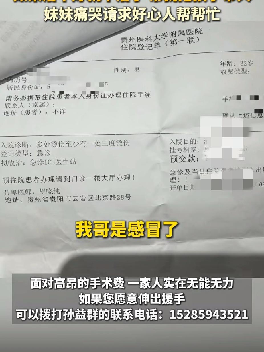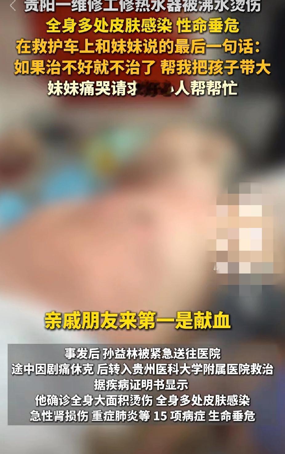 “别医我了,帮我把娃养大!”是他在救护车上对妹妹说的最后一句话!维修工修热水器被沸水持续烫一分钟,引发15项急症,生命垂危! 贵州贵阳维修师傅孙益林在维修热水器拧螺丝时,因热水器内部气压过大而狂喷沸水。孙益林被困在洗手间这个狭小的密闭空间里,被沸水持续烫伤一分多钟。当时孙益林就出现了红肿脱皮的症状! 孙益林同事当时给孙益林妹妹打去视频,看到视频中哥哥坐在地上,全身的皮一直往下掉,看着令人揪心! 救护车上,孙益林多次因痛感过于强烈而休克。休克前对妹妹说的最后一句话是:“不要医我了,帮我把娃养大!” 据悉,孙益林有个5岁的儿子。孙益林出事后,儿子一直在哭闹着找爸爸,家人只能谎称:“爸爸感冒了,在医院还没回来。”至今,儿子还不知道自己的爸爸生命垂危! 医院诊断:孙益林全身大面积烫伤、肺部严重感染、急性肾损伤、全身皮肤多处感染等15项病症,危在旦夕! 目前,治疗费用已经花费两万元,水滴筹两万元。亲朋好友先后两次聚集在医院,第一次为孙益林献血,第二次为孙益林捐款。 孙益林因长年在外务工,所以未缴纳医保,所有费用只能自行承担。 目前,家中值钱的东西能卖的都卖了,亲朋好友也纷纷为其捐款,只为救他一命!但所筹集的钱与治疗费用相比,只是冰山一角! 医生表示:“就算抢救过来,后期的恢复费用也要高达160万元!” 可是如今抢救都难上加难,孙益林的家人只想先保住他的命! 孙益林的妹妹向记者求助,希望能得到社会好心人的帮助,救哥哥一命! 网友求助 网友求助 网友求助