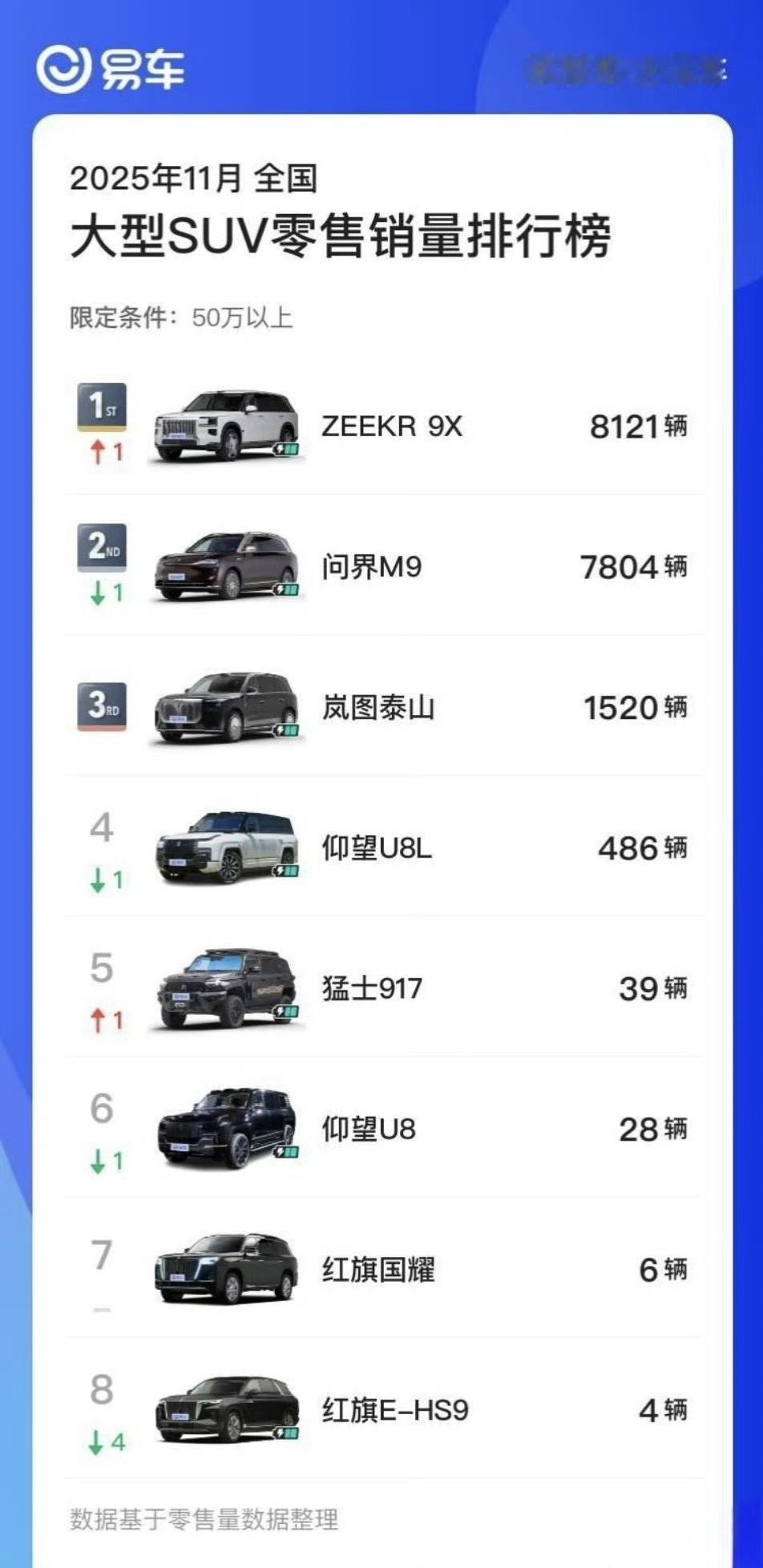 极氪9X月销8121辆,均价53.8万,顶配要加价买,海外用户很喜欢,就是需要加价20万才能买到。 咋说呢,如果你理性买车,同时在乎一辆车的机械素质和智能驾驶,你应该选择极氪9X。 极氪9x重新定义旗舰suv。【来自懂车帝车友圈】