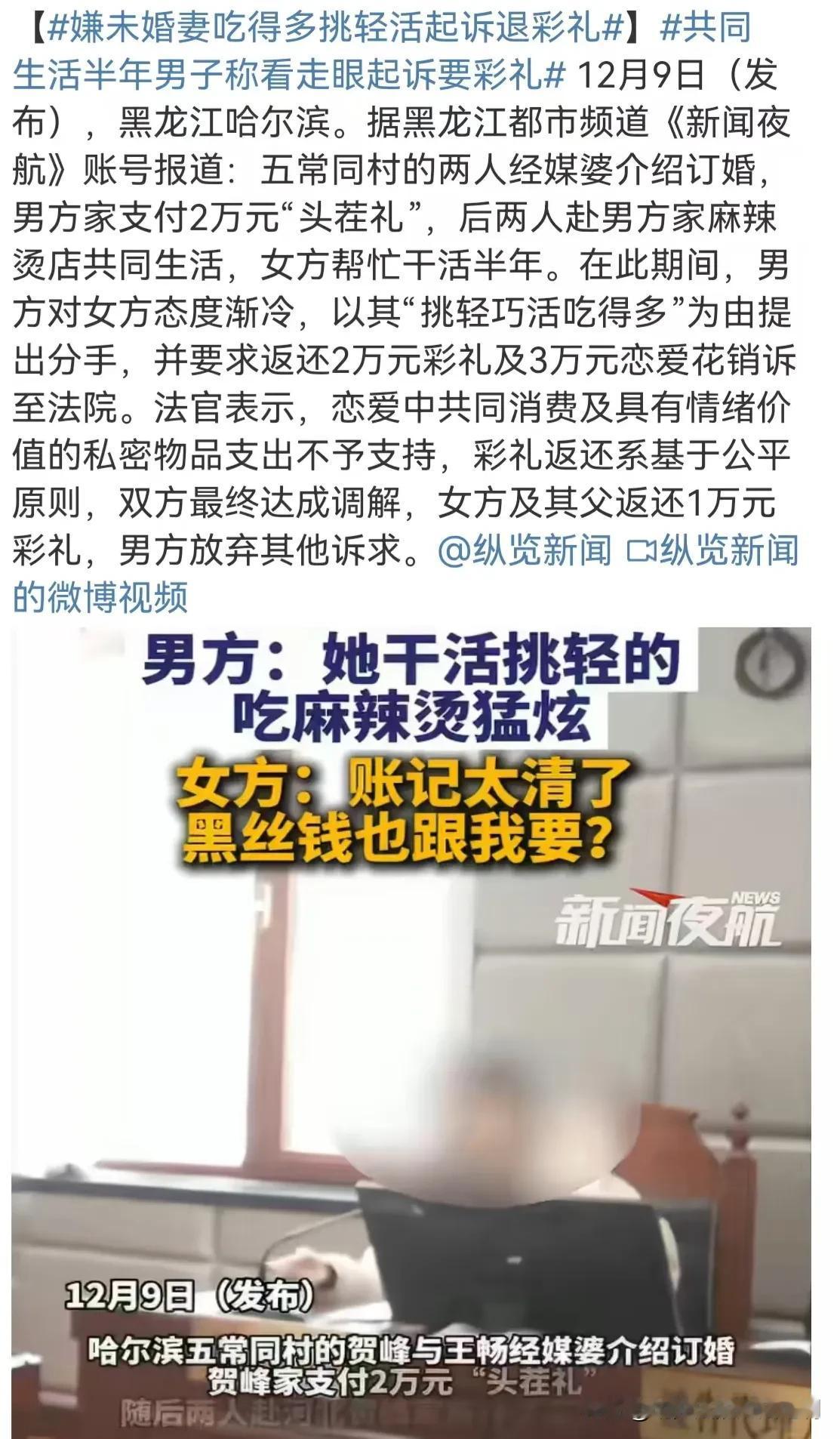 黑龙江哈尔滨,男子经媒婆介绍跟同村女子订婚,又给了对方2万的头茬礼。确定关系后,女方来到男子的麻辣烫店里帮忙。谁知同居了半年,男子感觉女方干活挑三拣四,吃饭还吃的多,因此心生不满提出分手。又想到给女方花了5万块钱,遂要求女方返还。女方:买黑丝的钱也要?(来源:新闻夜航) 事情的大致是这样的,男子刘某在外打工多年,手头上有些积蓄后,便回到了老家,开了一家麻辣烫。 刘某待人真诚,麻辣烫的分量也大,味道也好,很快在当地就积累了一些口碑,每天去他那里吃饭的人很多,刘某每天都忙得脚跟不沾地。 这样的日子维持了很长时间,直到父母提醒刘某,钱没有挣完的时候,年龄可是一天比一天大了。 言外之意,希望刘某能尽快找一个真心如意的另一半。 因为刘某需要忙于生意,平时根本就没有时间,于是便委托媒婆帮自己物色一个。 对于女方的要求也不高,只要能吃苦耐劳孝敬父母就行。 门牌的效率很高,很快便在同村帮刘某物色了一个对象王某。 两个人见面后互相看对了眼儿,接着双方父母见了面,商定了两个人之间的亲事。 刘某的条件还不错,在订婚仪式上给了王某2万元的彩礼。 确定了关系之后,王某便来到刘某开的麻辣烫店帮忙,可两人相处了才半年的时间,刘某对王某就不像之前那么热情了。 至于原因,有些让人哭笑不得。 原来,刘某感觉王某在店里,帮忙只挑一些轻快干净的活,对于刷盘子扫地这些脏活累活从来都不伸手。 还有,王某的饭量很大,自己煮一锅麻辣烫都不够她一个人炫的。 刘某感觉王某并不是自己理想中的那一半,于是便向王某提出了分手。 两个人分手之后,刘某突然想到在交往期间刘某曾给王某2万彩礼还给王某花了3万多块钱用于日常的开销。 为了避免人财两空的局面,刘某要求王某返还5万元。 王某虽然同意两个人分手,不过对于刘某斤斤计较的做法难以理解。 在两个人交往期间,刘某确实给自己花了一些钱,可他竟然一笔一笔的全部都记着,这样的行为让她难以接受。 另外,王某在店里打工的,这半年可是一分钱的工资也没要,于情于理,刘某都不能要求王某全额返还。 那么从法律的角度,该如何看待这件事呢? 《最高法关于审理涉彩礼纠纷案件适用法律若干问题的规定》第六条规定,双方未办理结婚登记但已共同生活,一方请求返还按照习俗给付的彩礼的,人民法院会根据彩礼实际使用及嫁妆情况,综合考虑共同生活及孕育情况、双方过错等事实,结合当地习俗,确定是否返还以及返还的具体比例。 依据上述法律条款,刘某与王某尚未登记结婚,在此前提下,刘某实际上是有权要求王某返还彩礼的,不过至于返还的多少,还需要根据实际情况来确定。 另外,两个人在恋爱期间,刘某为王某的花销大部分都是用于维持两个人之间的感情,刘某要求王某全额返还的要求,对于王某来说并不公平。 最终两家人经过协商,王某返还刘某1万元。 对此你怎么认为呢,关注@胡究法的如法炮制 多学法律少吃亏?