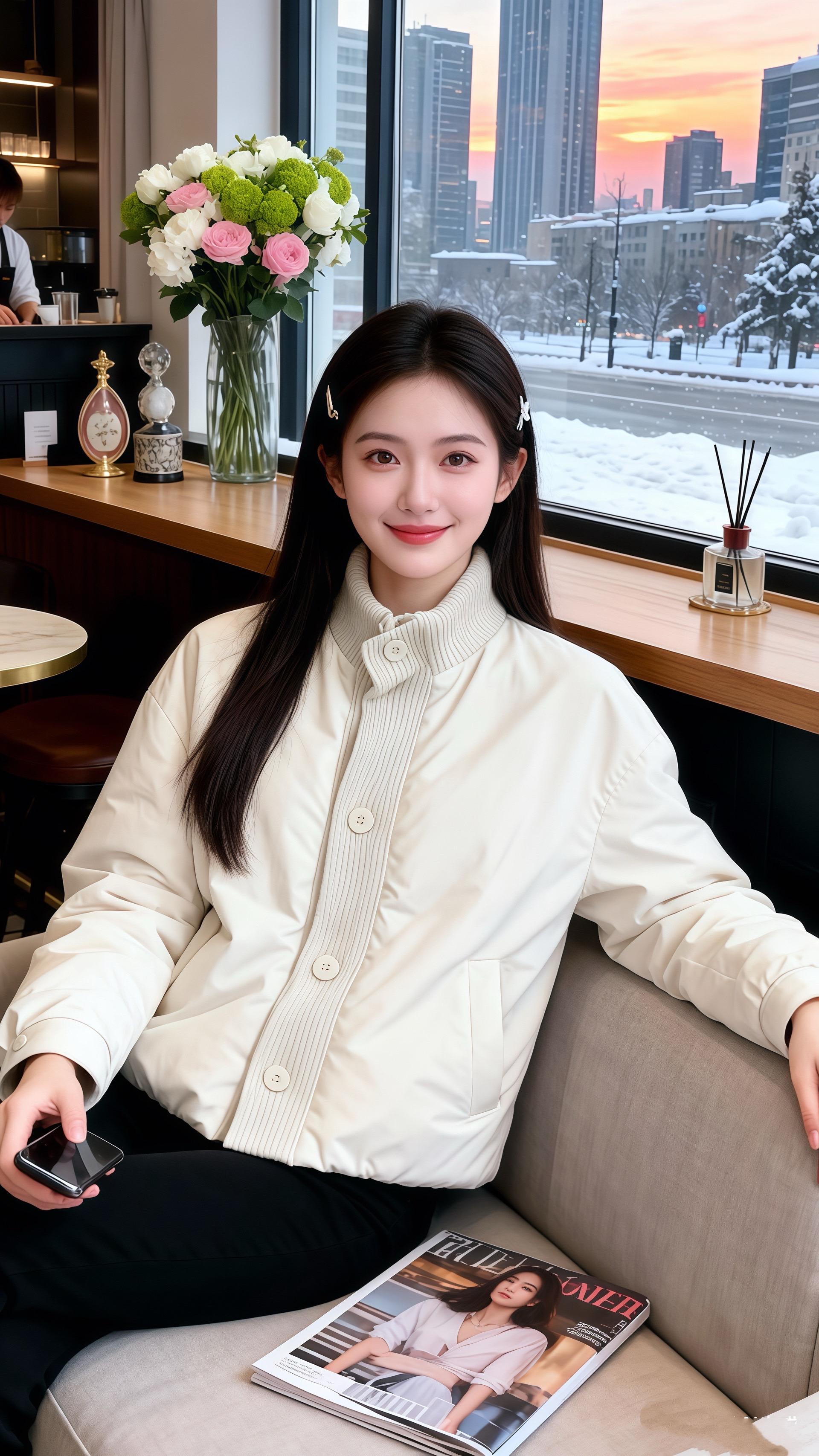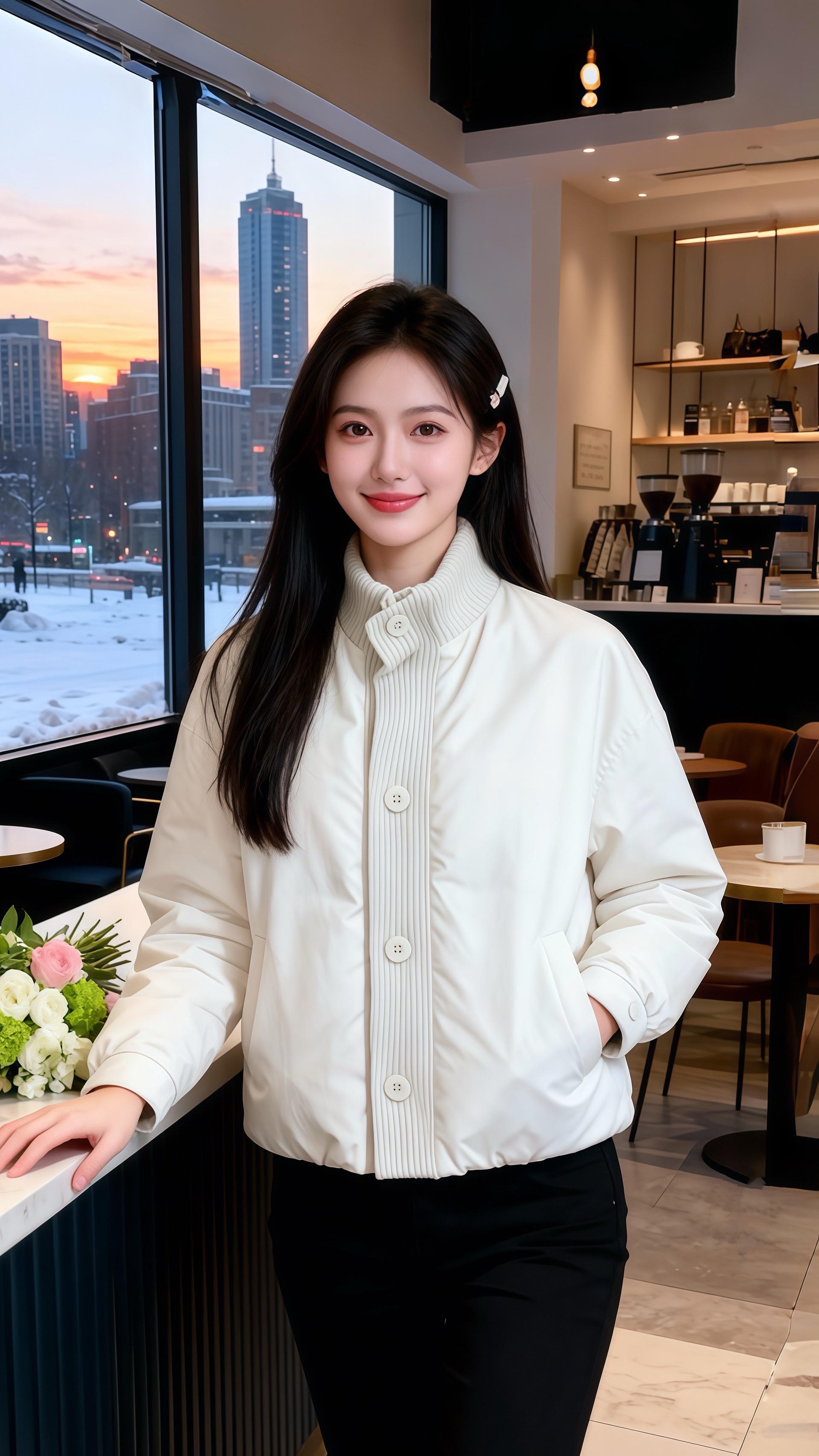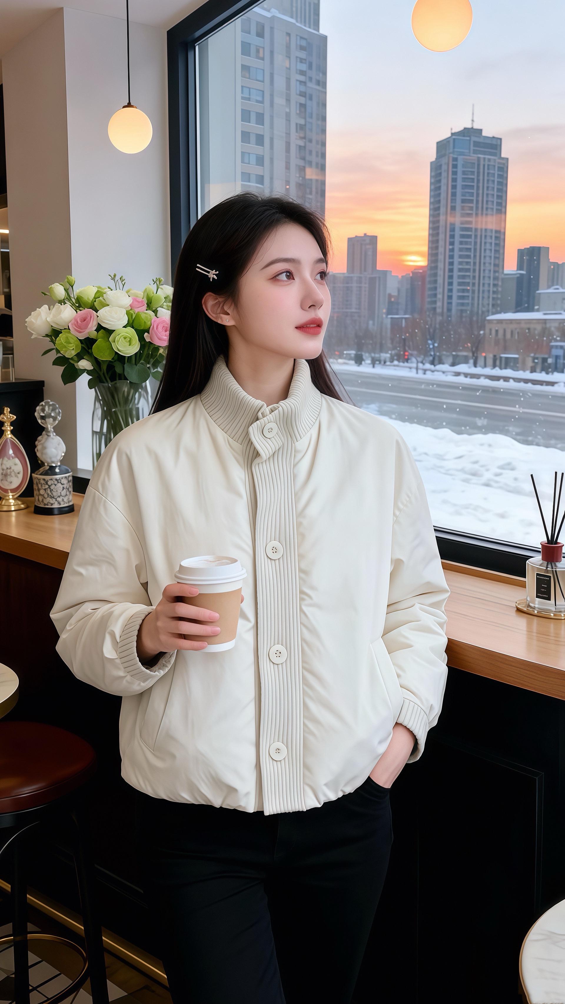 她穿米白色立领短外套,面料带着细腻的哑光质感,门襟处的竖纹针织拼接添了精巧的细节,单排纽扣顺着衣身排列,简约中藏着温柔的设计感。下配黑色长裤,裤型挺括却不生硬,和外套的软糯形成巧妙对比,整身穿搭像冬日里的奶盖茶,清甜的米白糅合着黑的深邃,连桌旁的花束都成了灵动的点缀。