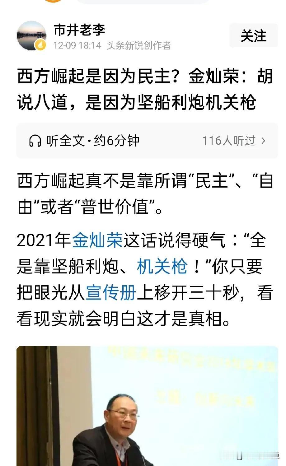 很佩服金专家的观点,西方的崛起,是因为船坚利炮 按照金专家的说法,国家要崛起,就必须有船坚利炮 不然的话,西方国家就会卡你的脖子,掠夺你的财富,奴役你的民众,驯化你的思想 照着这个思路,哈马斯的地道就是为了巴勒斯坦的崛起 伊朗想尽办法的核发展,就是为了伊朗的崛起 按照这样的推理,新加坡等没有国防力量的富裕小国,估计长久不了,会被西方掠夺分赃了 但是是非曲直,黑白善恶,相信各人有各人的理解和看法 这些 现在就佩服金专家的观点,毕竟人家有见识才说这样的话