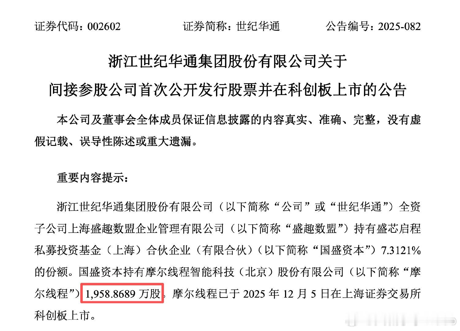 【游戏龙头参投摩尔线程或赚超6亿】多家A股公司参投摩尔线程大赚 “国产GPU第一股”摩尔线程(688795)近日成功上市,其股价持续大涨,多家A股公司有望从中受益。12月10日晚,A股游戏龙头世纪华通(002602)披露了对摩尔线程的具体持股情况。公告显示,世纪华通全资子公司上海盛趣数盟企业管理有限公司持有盛芯启程私募投资基金(上海)合伙企业(有限合伙)7.3121%的份额。截至公告披露日,国盛资本持有摩尔线程1958.8689万股,国盛资本所持股份占摩尔线程首次公开发行前总股本的4.8968%,占摩尔线程发行后总股本的4.1676%。国盛资本持有摩尔线程股份限售期为摩尔线程上市后12个月。世纪华通表示,根据企业会计准则相关规定,公司对所持国盛资本的份额划分为“以公允价值计量且其变动计入当期损益的金融工具”,并列报在“其他非流动金融资产”中。以摩尔线程2025年12月10日收盘价为基准初步估算,公司所持份额预计对公司2025年第四季度净利润影响金额为6.4亿元,约占2024年度公司经审计归母净利润的53%。除世纪华通外,还有多家A股公司通过多种方式参与了对摩尔线程的投资。如和而泰近期在投资者互动平台表示,公司持有摩尔线程410.5109万股。按照摩尔线程12月10日收盘价计算,这部分股权市值高达30亿元。(e公司)
