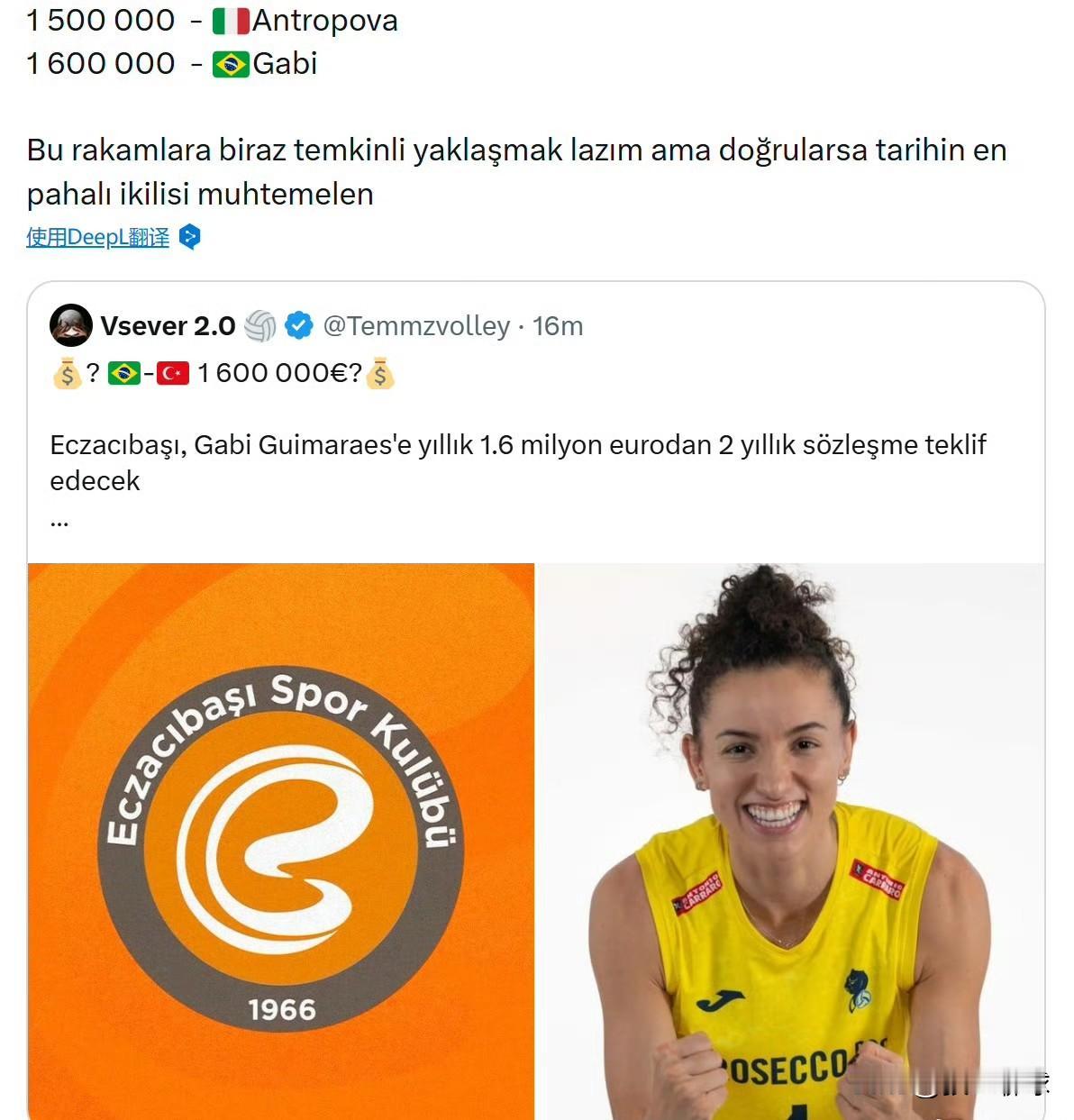 据巴媒消息,伊萨奇巴希提供了一份为期两年、年薪为160万欧元的合同给加比.吉马良斯。 给安特罗波娃150万欧元/赛季。 国外博主自己都说:对这两个数字要稍微谨慎对待,但如果属实,这很可能就是排球历史上最昂贵的(外援)组合。 伊萨奇巴希要对球队进行大换血……