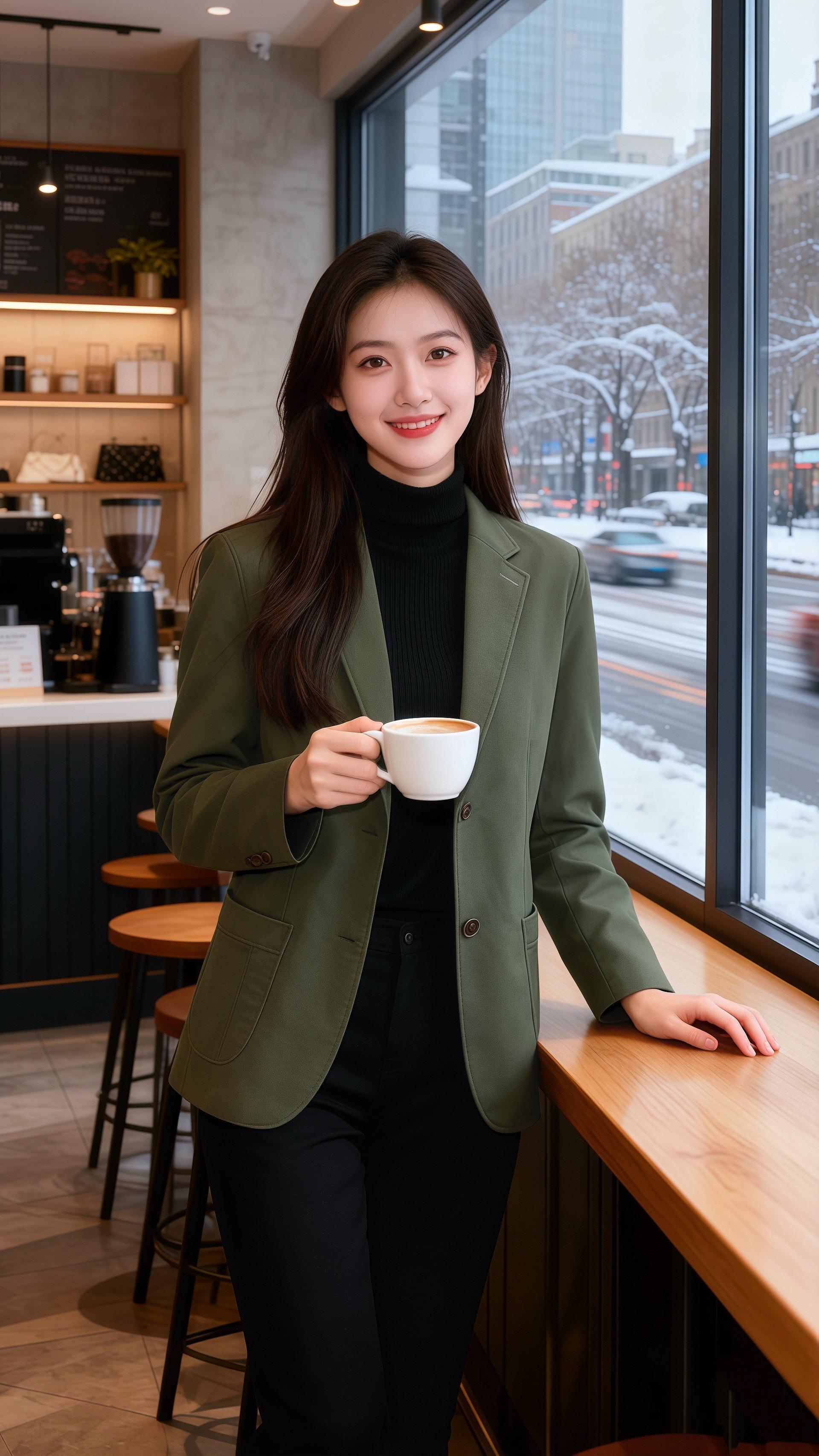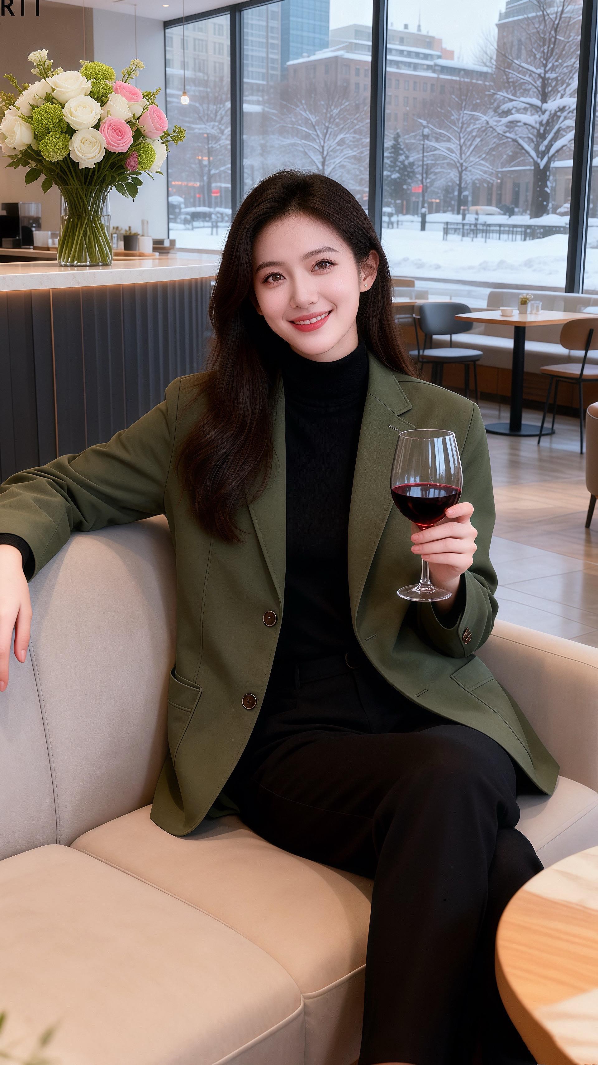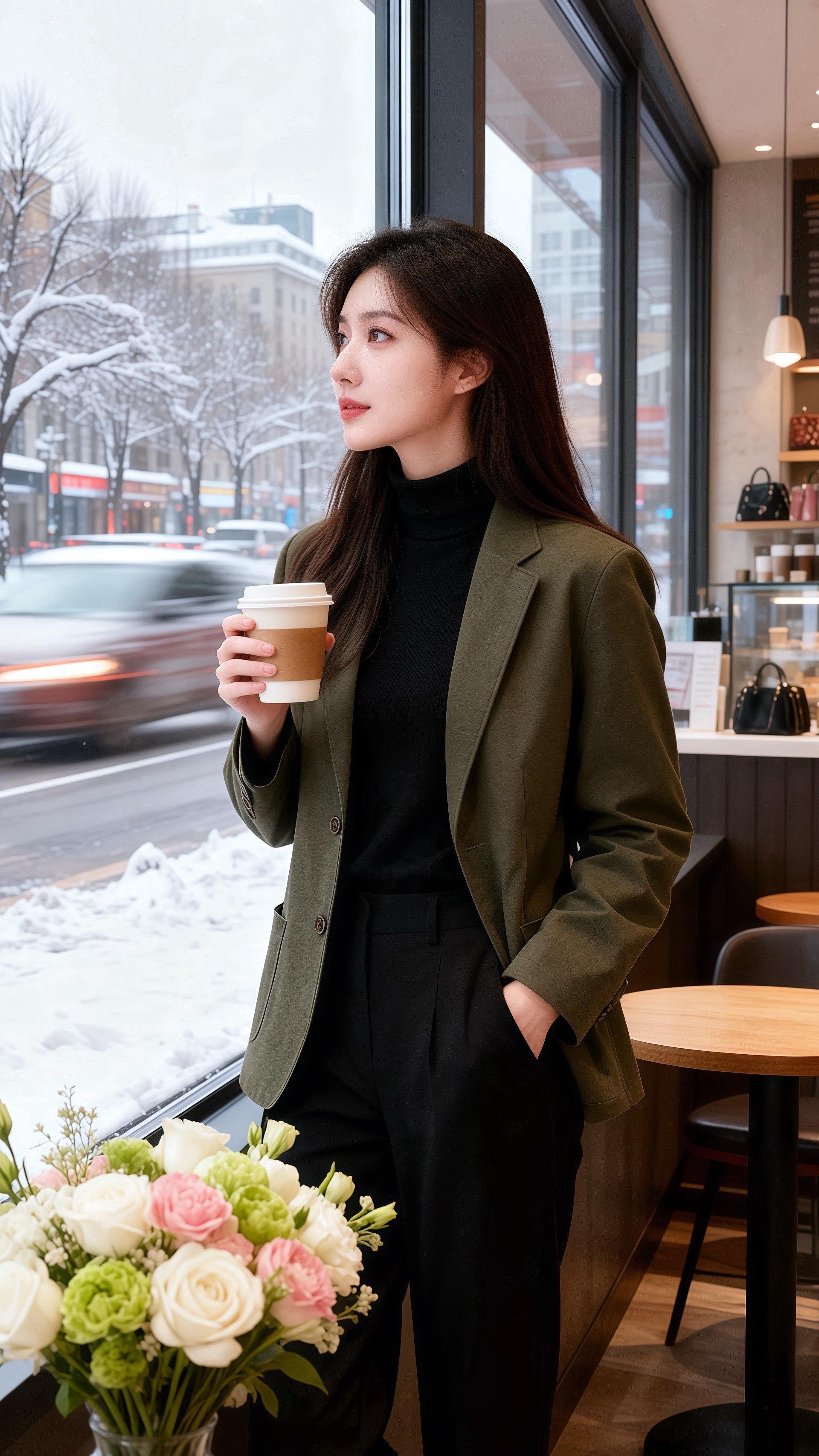 她穿墨绿色西装外套,面料带着细腻的肌理感,翻领的版型衬得肩线利落又优雅,单排扣的设计简约大气,内搭的黑色高领针织衫贴合身形,把脖颈的线条勾勒得温婉。下装是黑色直筒长裤,裤型挺括,和墨绿外套形成沉稳的搭配,整身穿搭像冬日里的松柏,冷调的绿糅合着黑的深邃,藏着干练又温柔的气质,连桌上的花束都成了点缀。