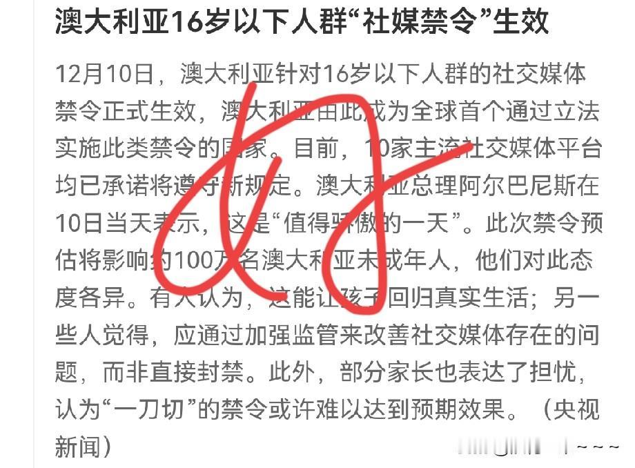 毫不手软! 16岁以下人群“社媒禁令”生效了!澳大利亚对孩子的“这一枪”打的挺狠的,本来以为人家发达国家挺自由的,我看管起孩子来一点也不手软,严格的很,真是刷新了我的认知! 虽然澳大利亚是全球首个通过立法的,但是,我查了一下资料,像马来西亚,新西兰,法国,美国,德国,丹麦,欧盟一些国家…也都在家考虑推进该项工作。特别是美国的佛罗里达州已经禁止14周岁以下禁止开通社交媒体账号。 看看法案一通过澳大利亚的总理都这么高兴,还说是“值得骄傲的一天”。所以,澳大利亚走了第1步后,如果效果不错的话,我想这些国家应该会马上跟着出台了。你们说人家管孩子为啥这么严格呢?能管得住吗?