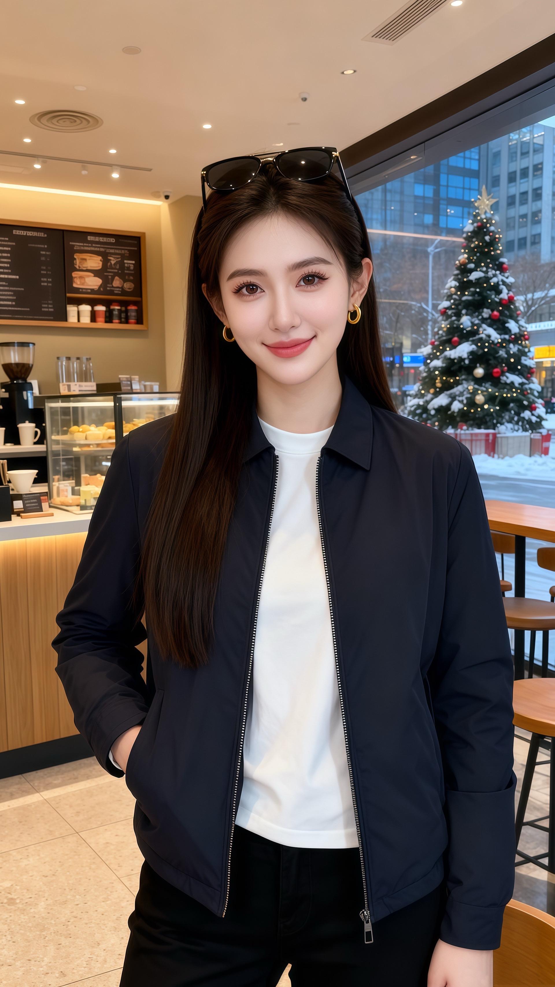 冬日雪落的午后,她推门进咖啡馆时,像裹了一身沉静的墨蓝。藏青色翻领外套的拉链半开,露出里面干净的白T恤,领口弧度刚好衬得脖颈纤长,黑裤贴着脚踝,是不动声色的利落。