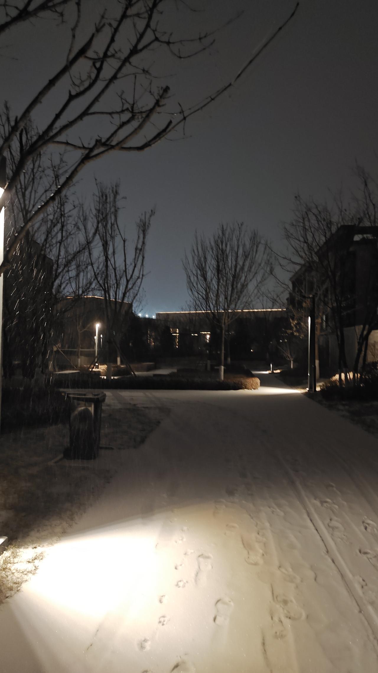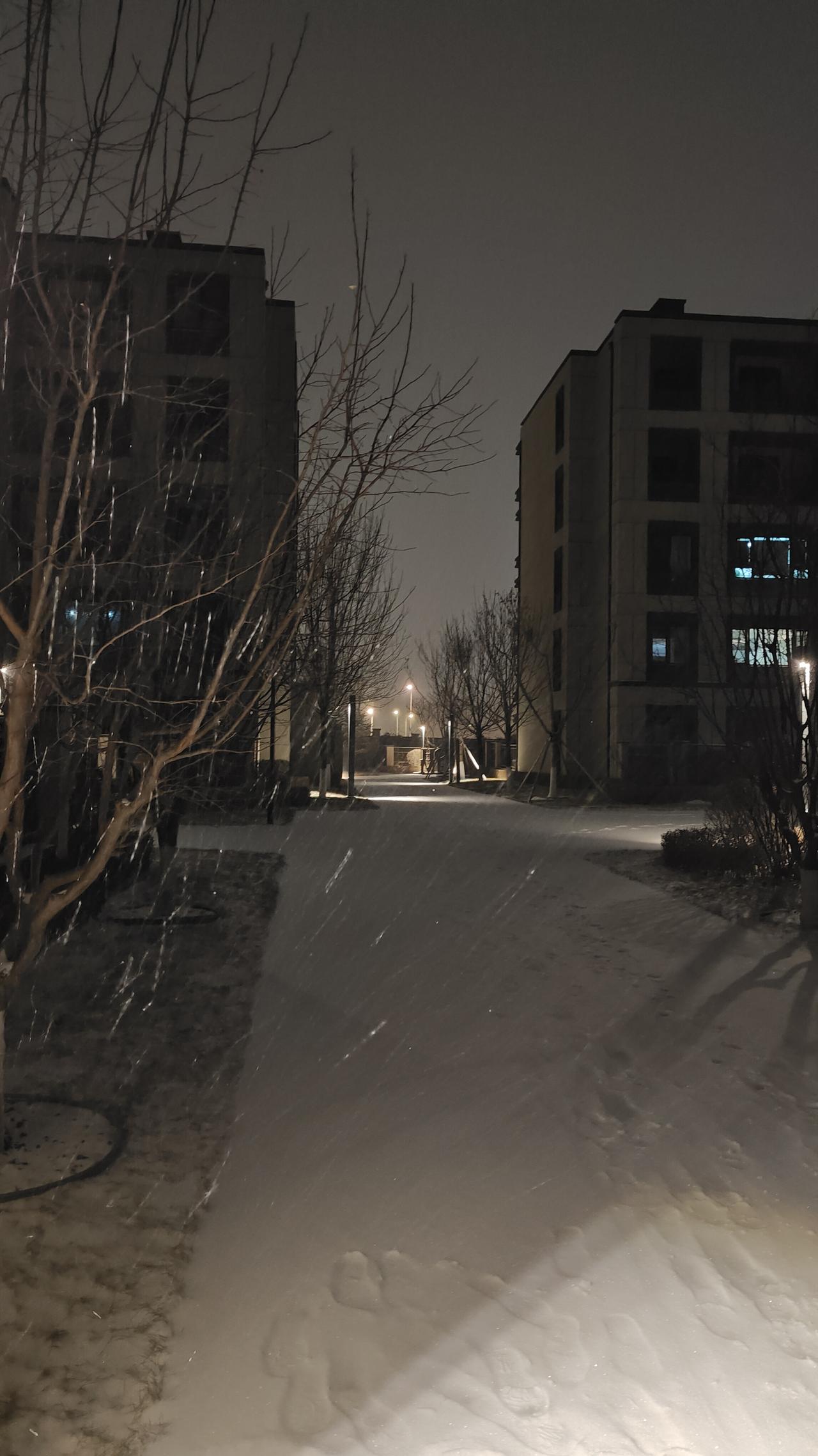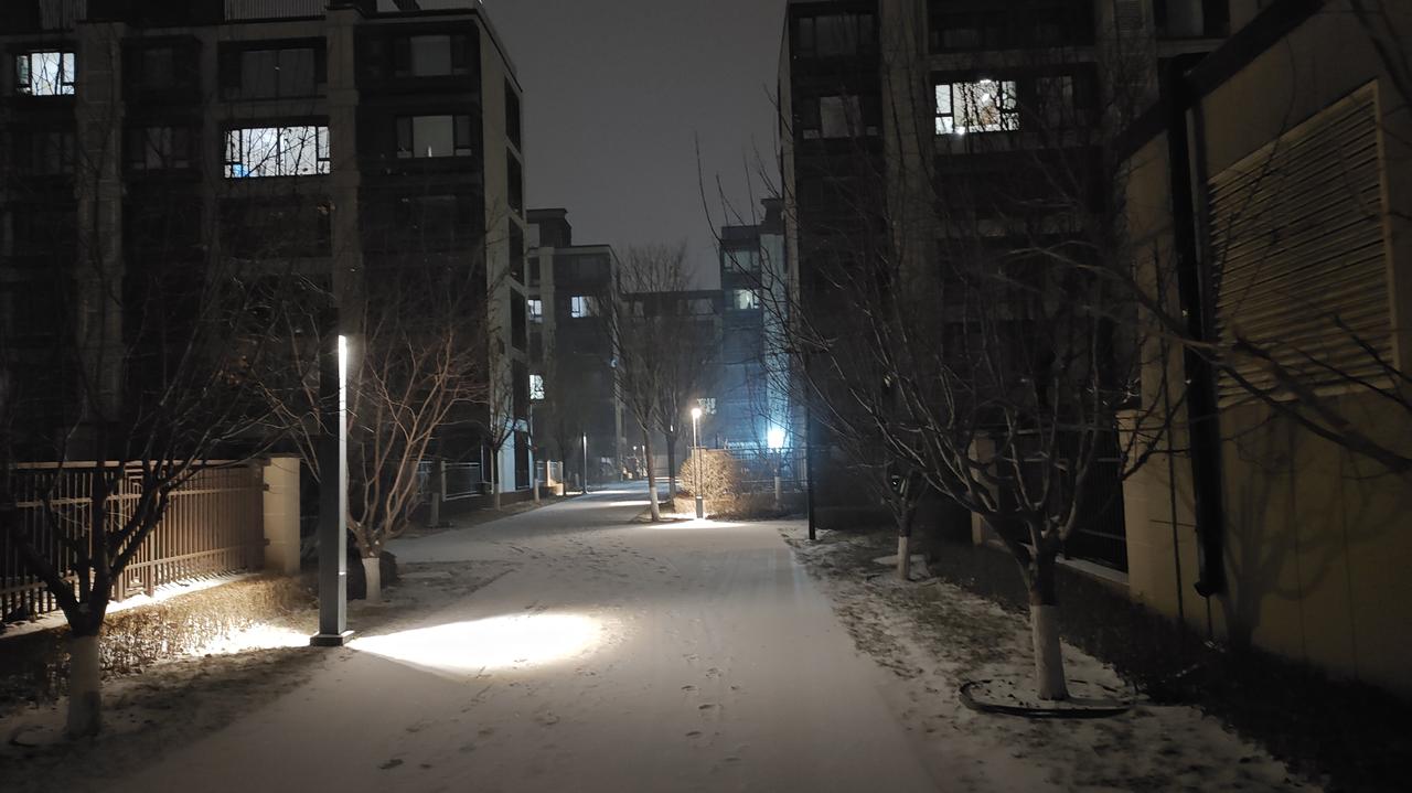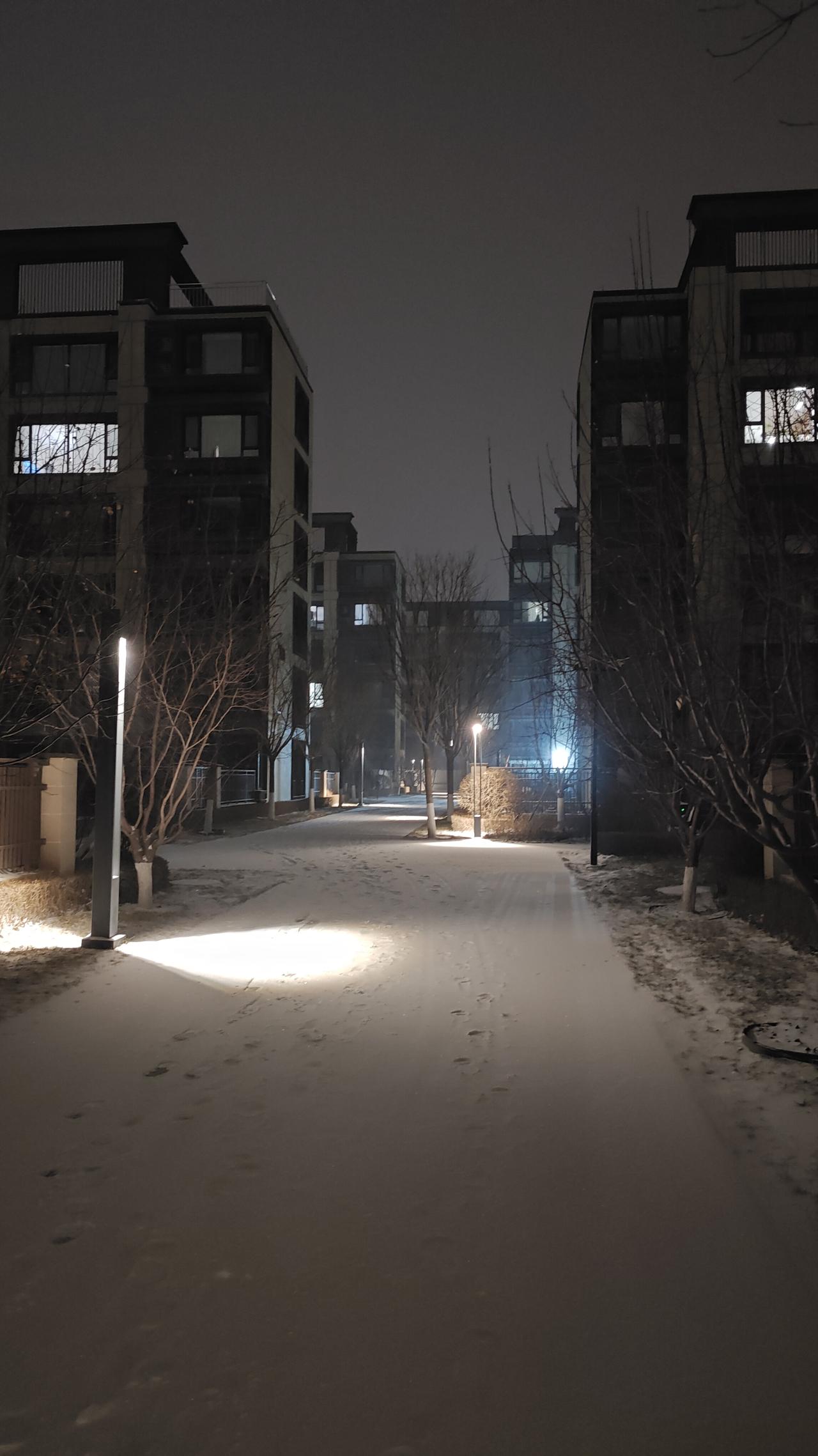 冬夜雪景,静谧的街道,暖灯映照,宁静而温馨。 街上的雪景 雪景氛围图 冬日夜景