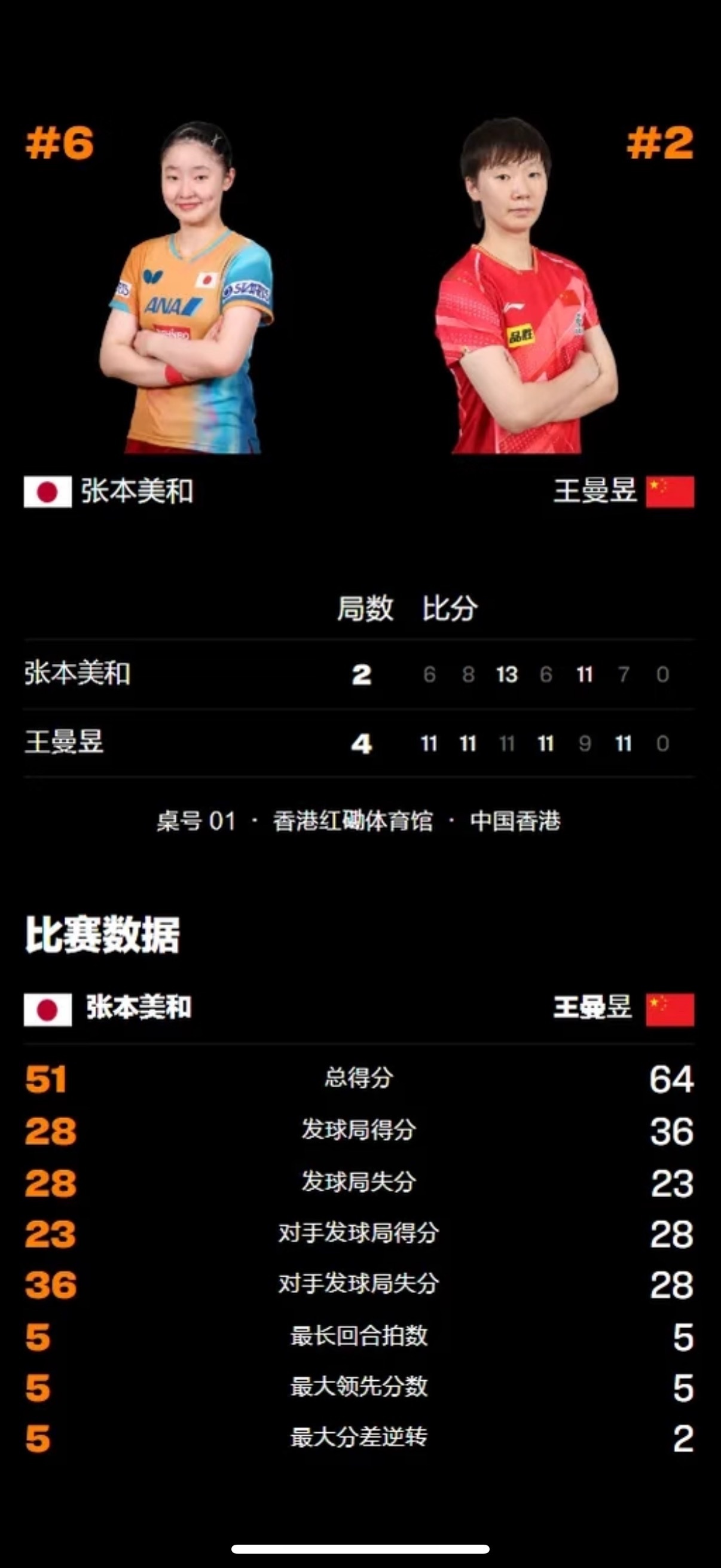 北京时间2025年12月10日晚,乒乓球WTT香港总决赛爆发中日焦点对决,两天前才在成都混团世界杯上交手的王曼昱、张本美和再次狭路相逢,结果上次3-0横扫对方且总战绩保持8连胜不败的王曼昱又以4-2取得胜利,由此而成为第3位晋级女单8强的国乒选手。王曼昱4比2胜张本美和王曼昱晋级香港总决赛8强