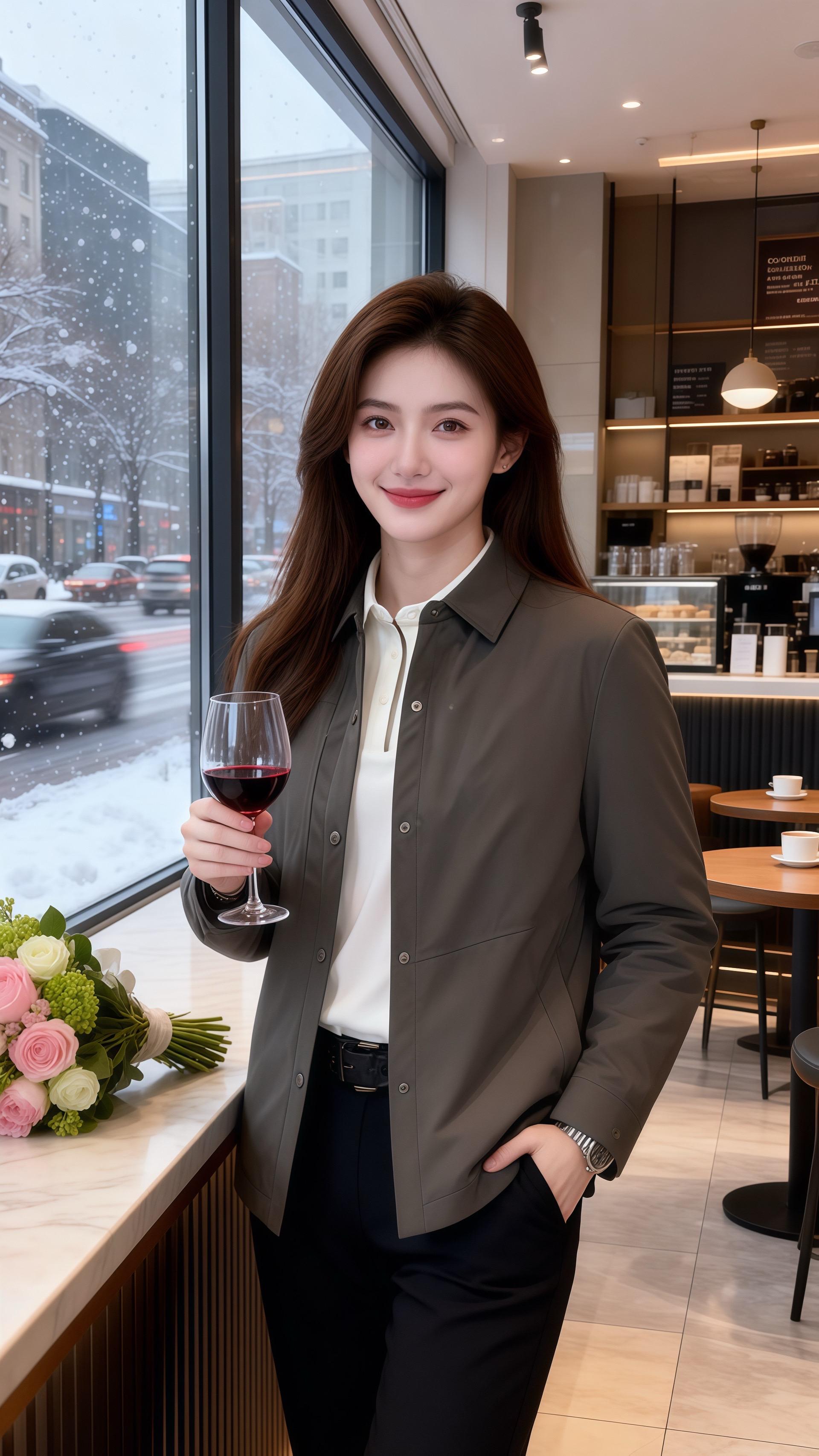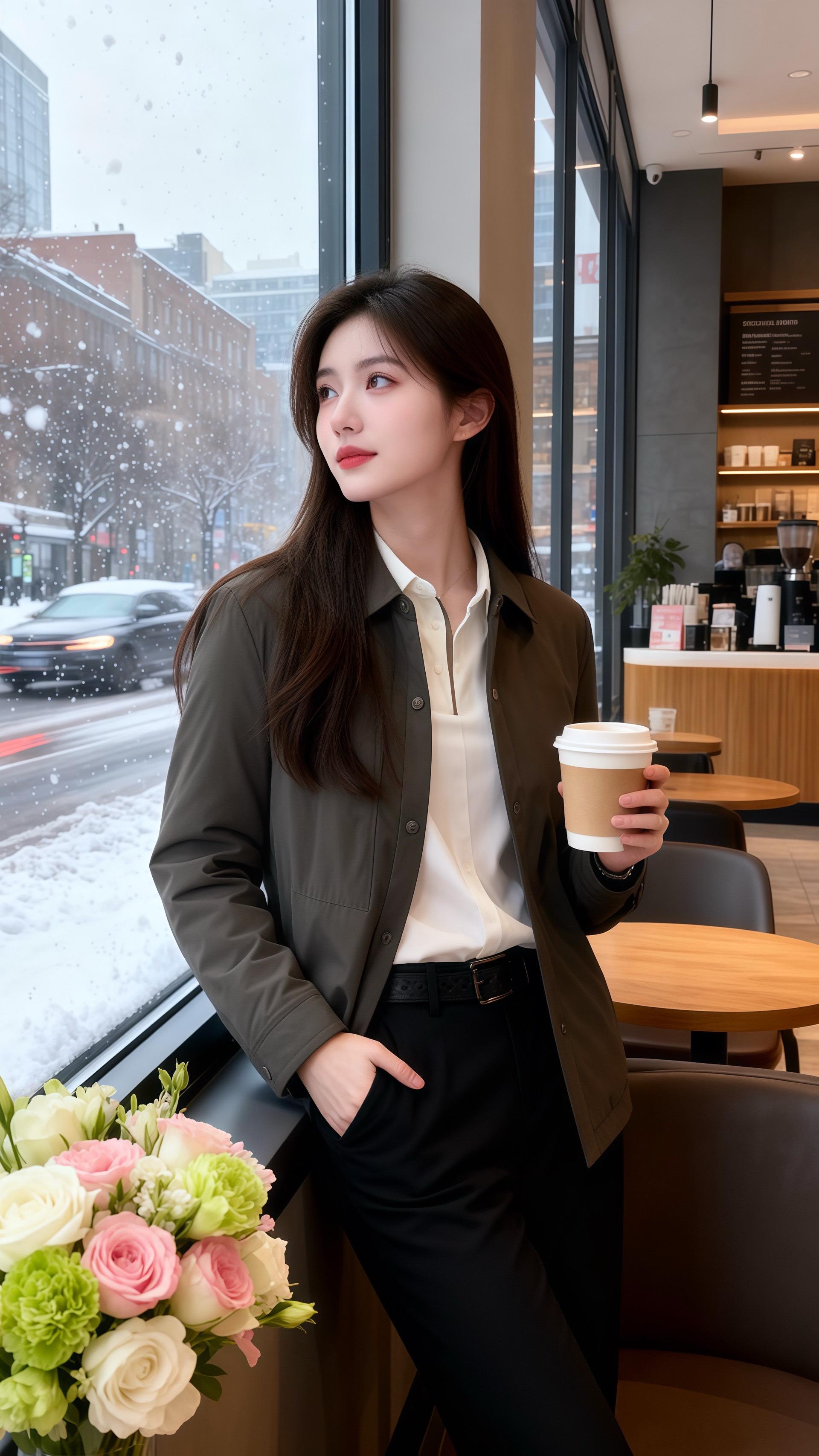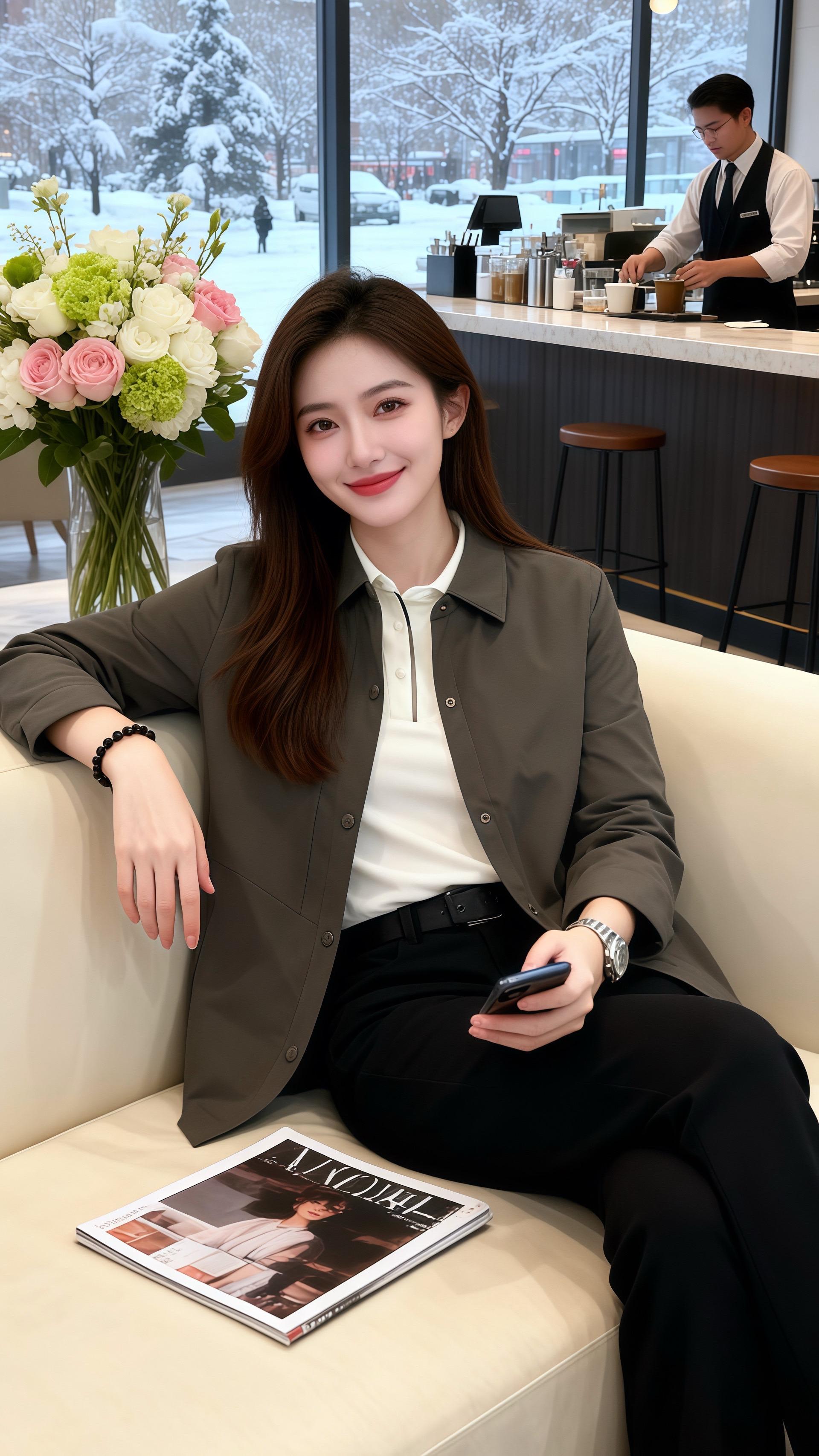 她穿深灰色翻领短外套,面料带着顺滑的哑光质感,单排纽扣顺着衣身排列,简约又大气。内搭白色半开领上衣,干净的白与沉稳的灰相撞,衬得气质愈发清爽。下配黑色长裤,裤型挺括却不生硬,和外套的休闲风格呼应,整身穿搭像冬日里的燕麦拿铁,醇厚的灰糅合着白的清甜,连桌旁的花束都成了灵动的点缀。