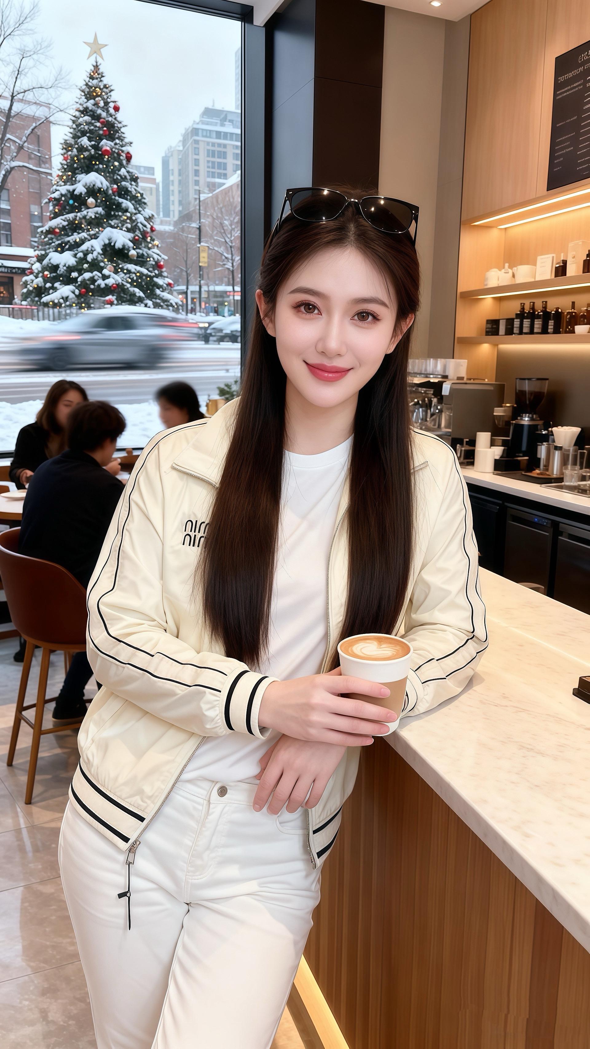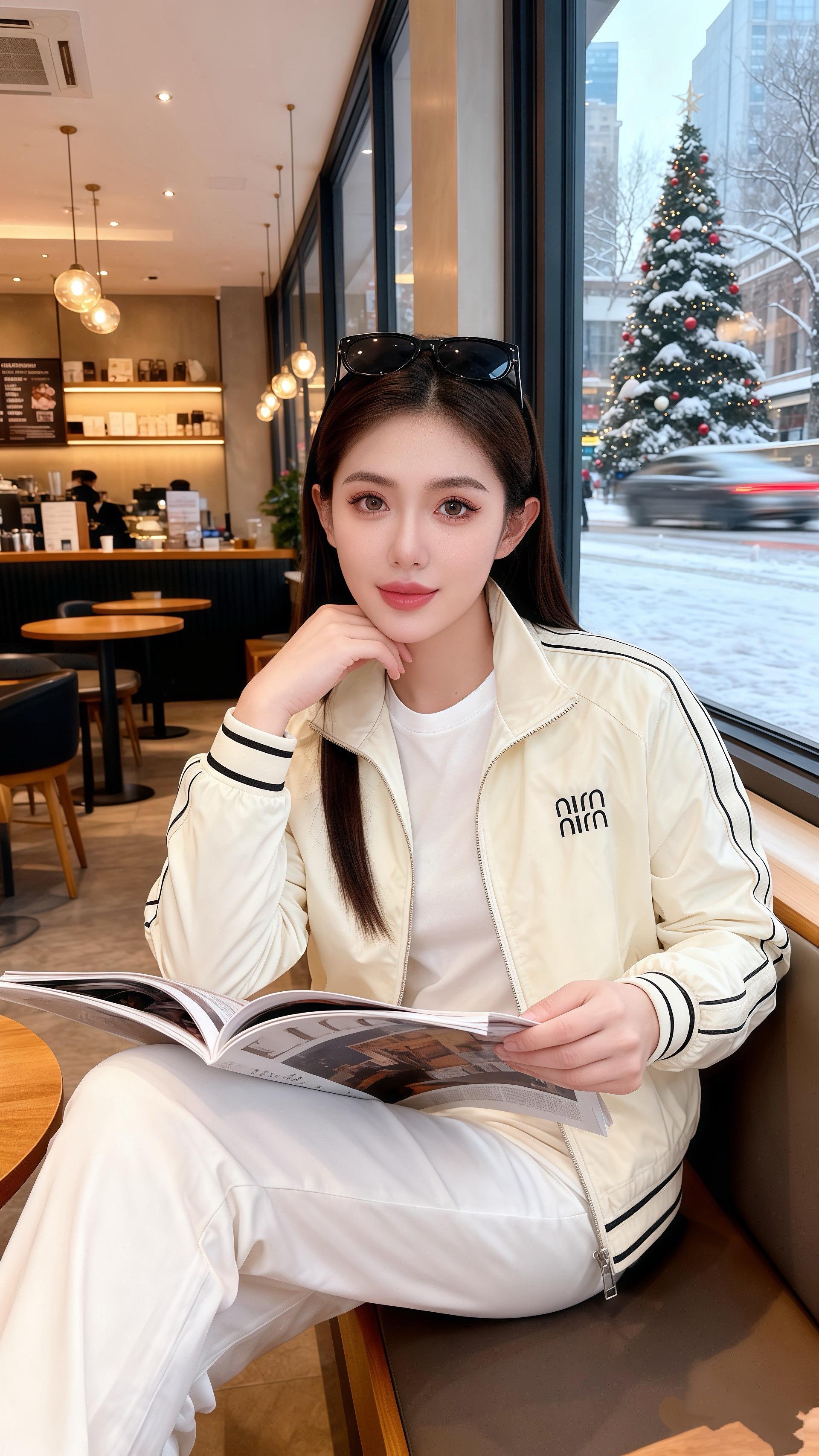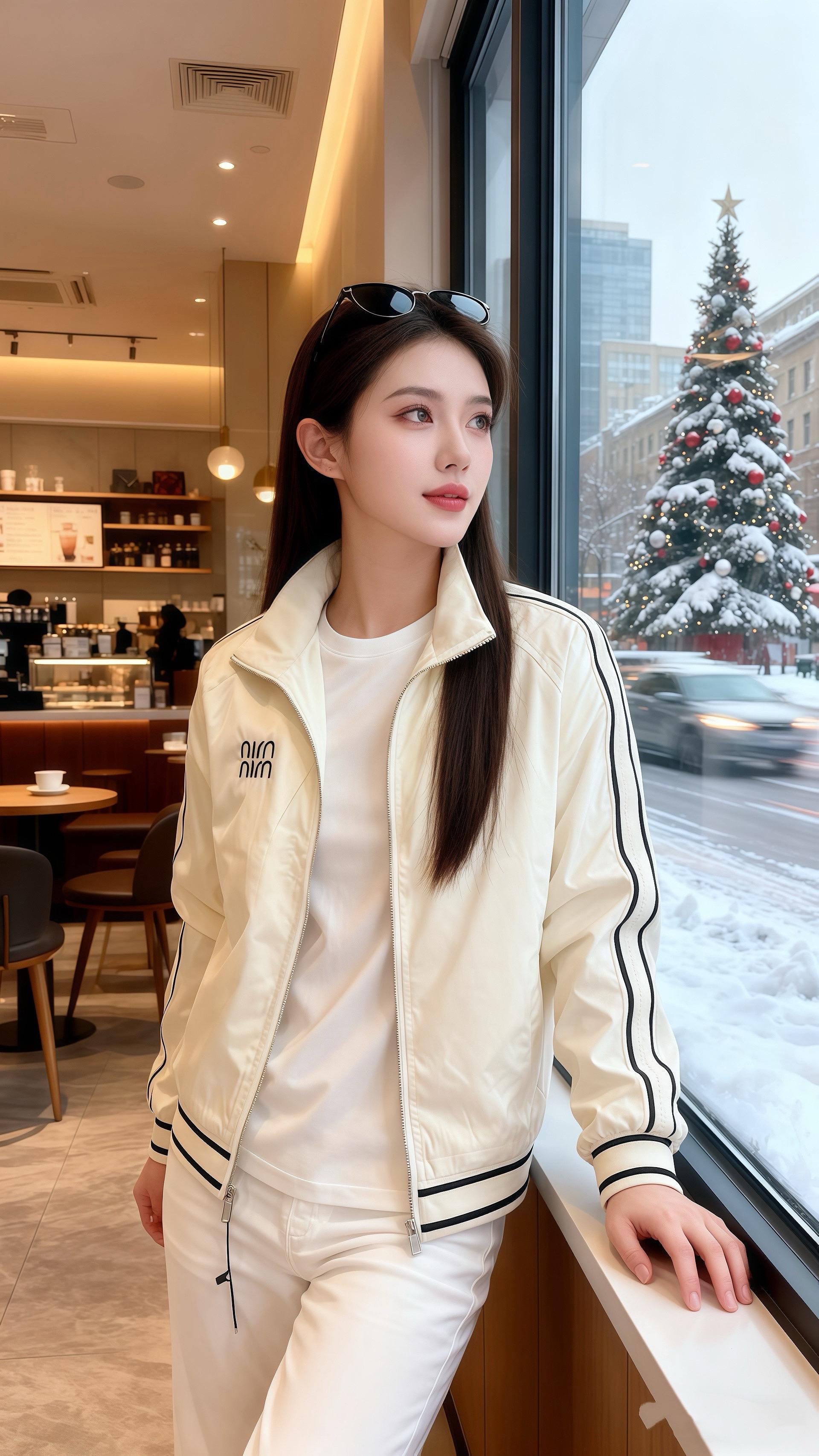 她穿米白色的休闲外套,面料带着柔和的哑光质感,黑色细条纹沿着衣身垂落,和袖口的黑边相衬,利落又不失柔和。内搭的白T恤贴合身形,领口露出的锁骨线条清浅,下装是同色系的白色长裤,裤腿宽松却不拖沓,和外套的休闲感呼应得恰到好处。墨镜架在发顶,乌黑的长发顺直地垂在肩头,整身白调的穿搭在冬日的暖光里,像揉碎了的月光,把窗外的雪色都衬得温柔。