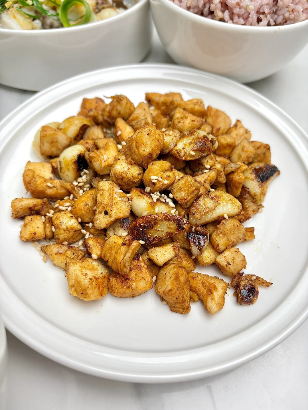 超级下饭的家常菜 家常菜 好吃下饭菜 今天晚餐长这样 今日菜单: 凉拌儿菜 蒜香孜然鸡肉粒 清蒸鲈鱼